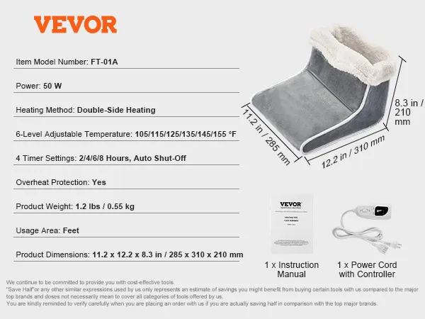 A Warm Gift: VEVOR double-sided heating foot shoes is a perfect gift for your lovers - warming cold feet, relieving arthritis, ankle sprain, and boosting blood circulation. The removable inner lining is hand or machine washable (Don't Iron and Tumble Dry, Please remove the controller before washing)
