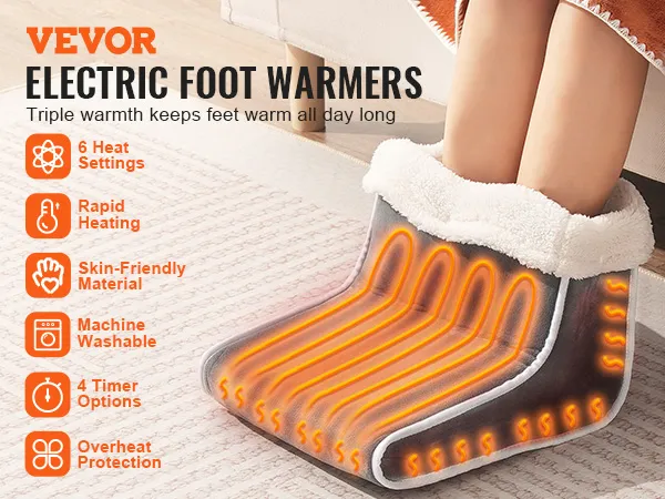 VEVOR Electric Foot Warmer, Double-Sided Heating Pad for Foot, 6-Level Heating Slippers Feet Warmer with Timer & Auto Shut-Off, Ultra-Soft Flannel Heated Boots Shoes Washable, Warm Gift for Women Men