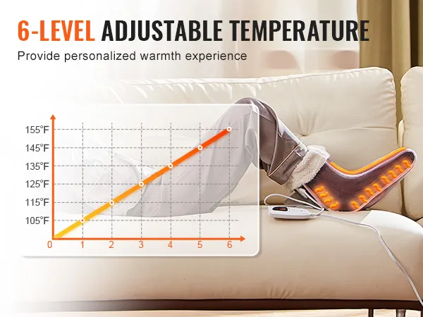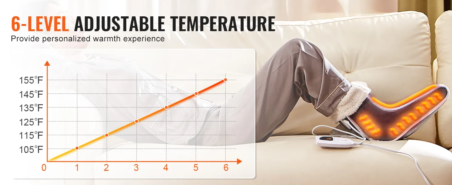 Our heating foot warmer features 6 heating levels, ranging from 105°F to 155°F, providing a personalized warmth experience. With the easy-to-use controller, you can easily adjust the settings to suit your preferences.