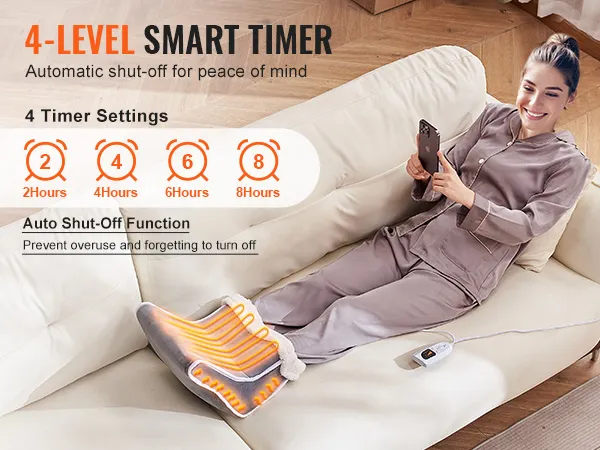 Upgraded Safety: The electric heating feet warmer with auto shut-off features 4-level smart timer (2, 4, 6, or 8 hours), preventing overuse or forgetting to turn it off. Plus, the built-in overheat protection lets you enjoy comfy warmth with peace of mind