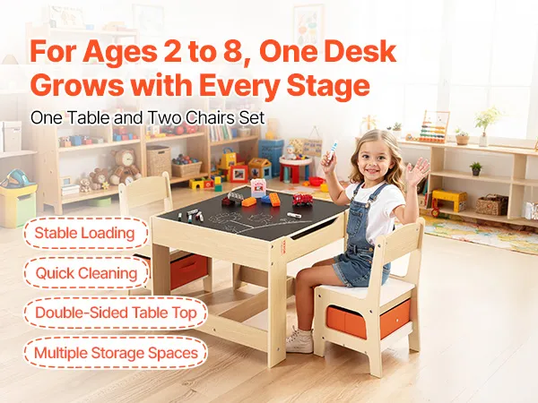 This kids table and chair set for ages 2–8 features a double-sided table and chairs with storage, ideal for crafts, toys, drawing, reading, meals, snacks, and imaginative play in playroom, bedroom, or daycare.