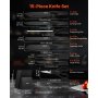15-delige messenset: Deze 15-delige messenset bevat een koksmes van 20 cm, een trancheermes van 20 cm, een broodmes van 20 cm, een Santoku-mes van 18 cm, een universeel mes van 13 cm, zes steakmessen van 11,5 cm, een schilmesje van 8,9 cm, een slijpstaaf van 20 cm, een keukenschaar en een houten messenblok. Eén set dekt al uw dagelijkse snijbehoeften, zoals snijden, hakken en schillen. Dankzij het moderne ontwerp is het een ideaal cadeau voor de feestdagen en speciale gelegenheden.