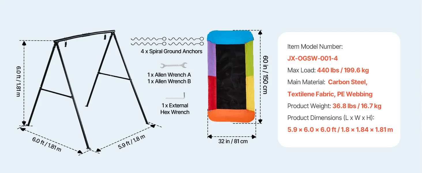 De stalen A-vormige constructie met verstevigde hulzen vormt een robuuste en stabiele driehoekige constructie. Zware buisverbindingen dragen bij aan de algehele stabiliteit van de schommel, terwijl spiraalvormige grondankers het frame stevig in de grond verankeren en beweging tijdens het schommelen minimaliseren.