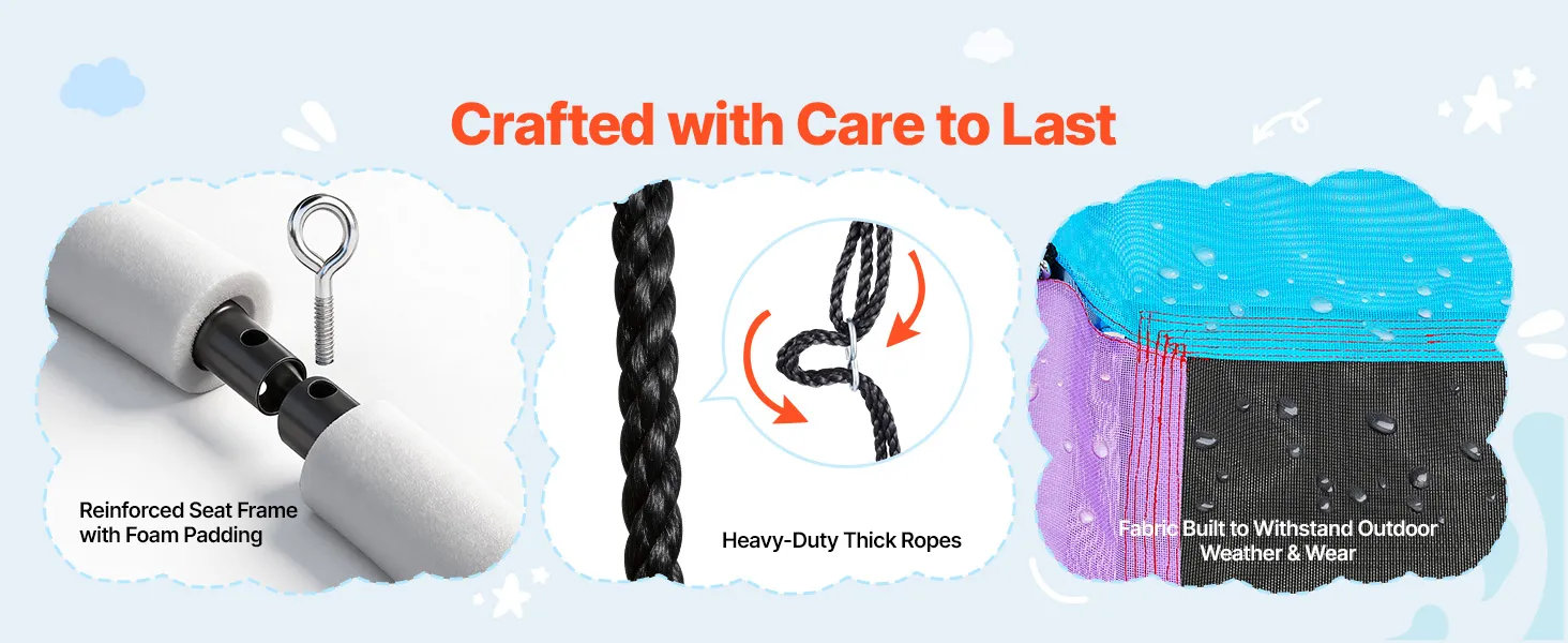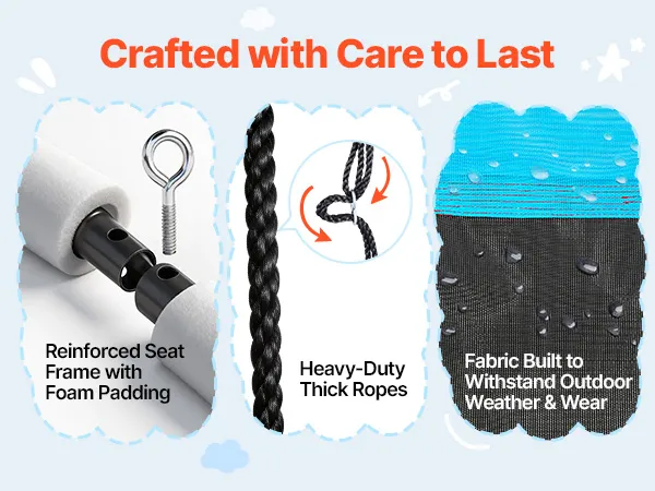 Een verstevigd frame met schuimvulling biedt hoge stabiliteit en comfort. De bekleding is duurzaam en kleurecht. Stevige, verstelbare touwen zorgen ervoor dat de schommel en het frame stevig op hun plaats blijven.