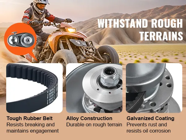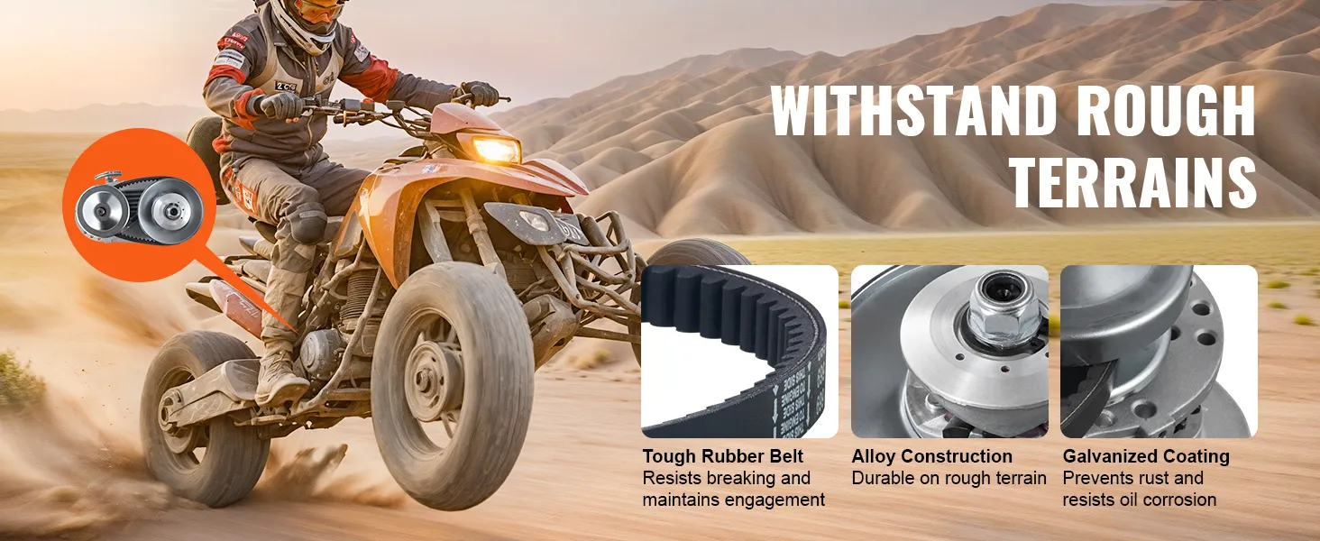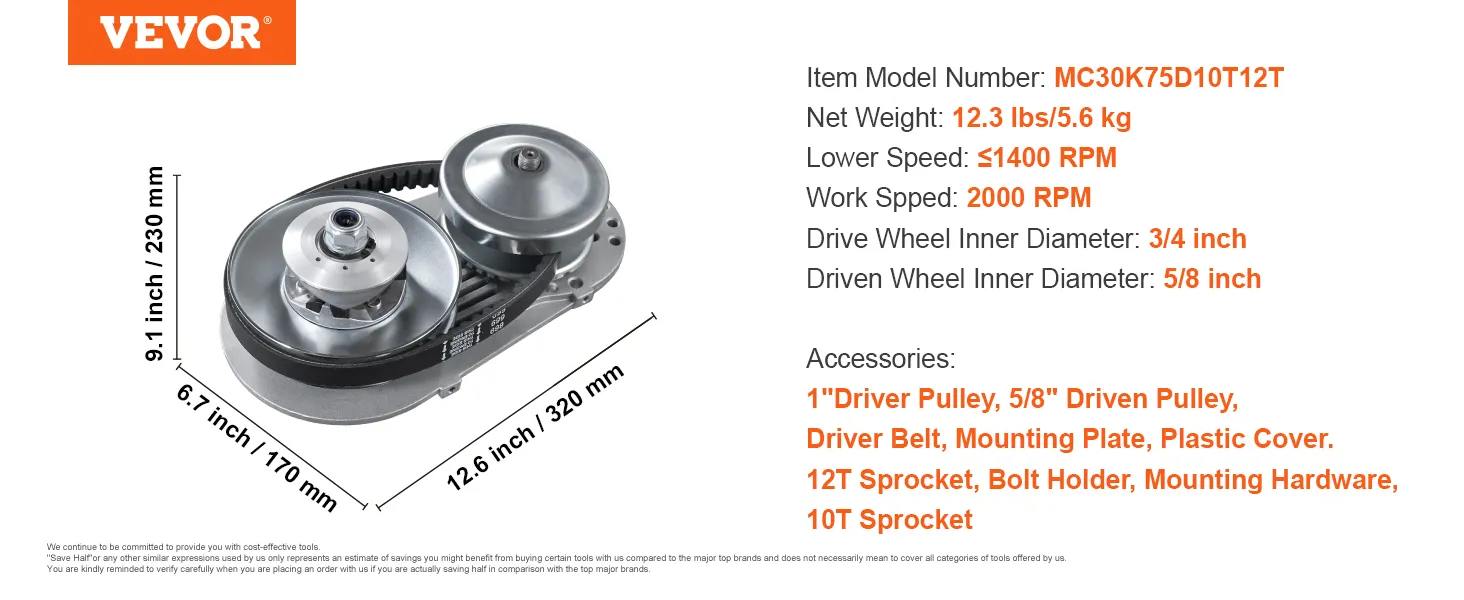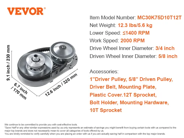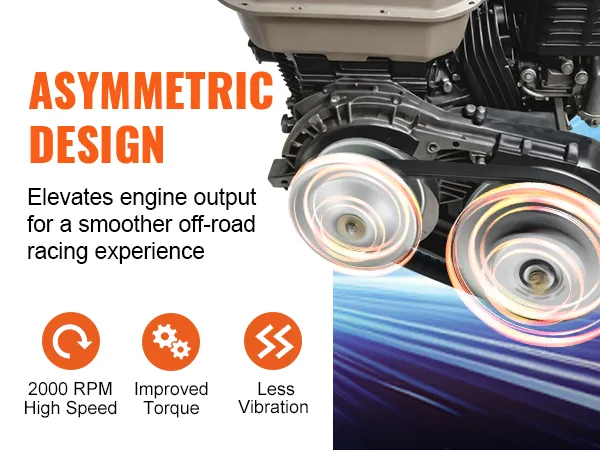 Verbeterd asymmetrisch ontwerp met een binnendiameter van het aandrijfwiel van 4 inch en een binnendiameter van het aangedreven wiel van 5/8 inch. Dit ontwerp vermindert het brandstofverbruik en zorgt tegelijkertijd voor een snelle reactie van de motor, voor verbeterde veiligheid en prestaties.