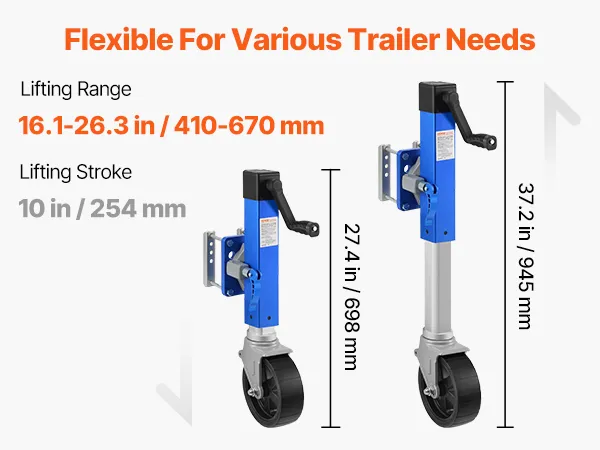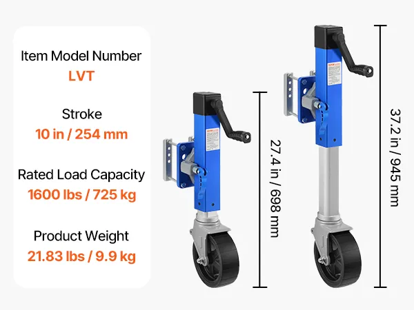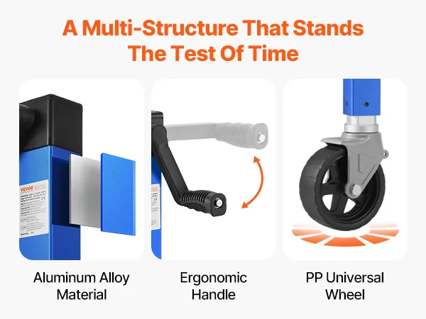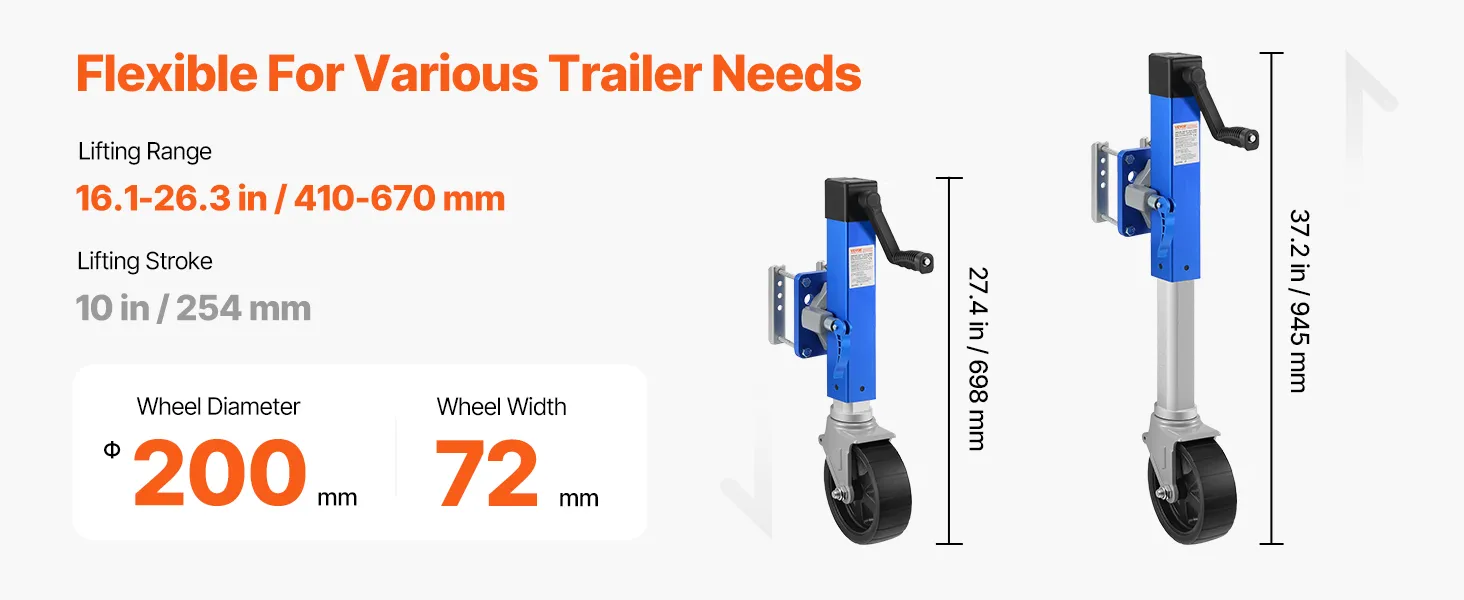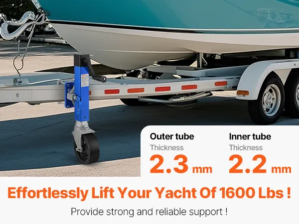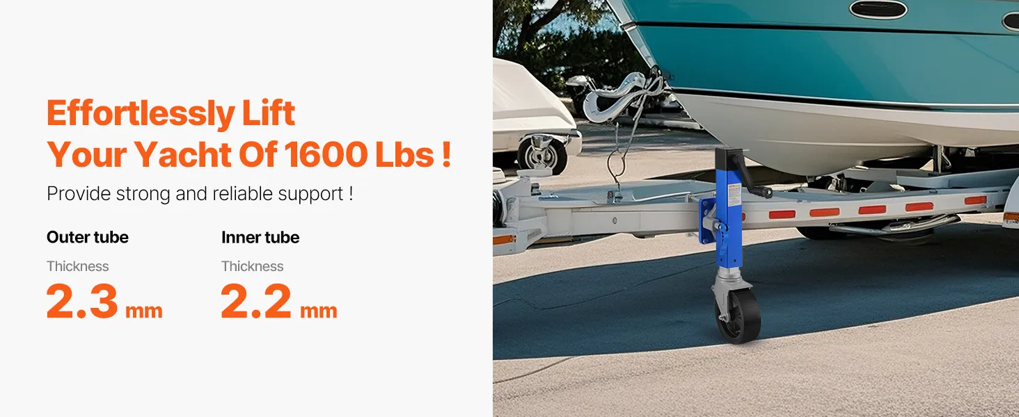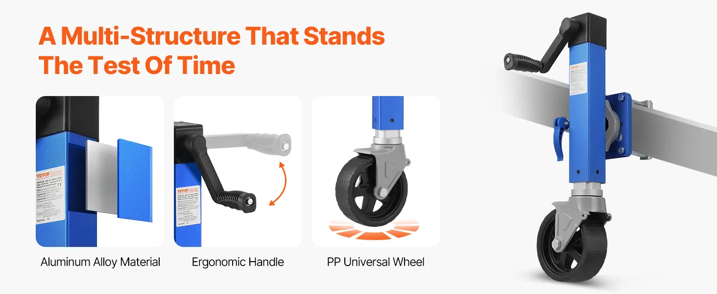 Het duurzame materiaal van een aluminiumlegering van de boottrailerkrik in combinatie met een roestbestendige coating zorgt voor een lange levensduur en een nieuw uiterlijk.