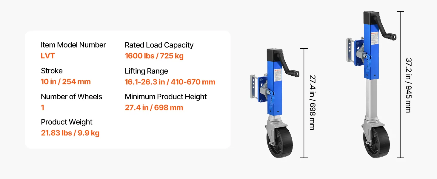 VEVOR Trailer Jack met wiel, 725 kg trailerondersteuning, draaibare boottrailerkrik PP enkel wiel, 254 mm hefhoogte, aan te bouten reisaanhangwagen met handgreep voor camper, boot, paardentrailer, aanhangwagen