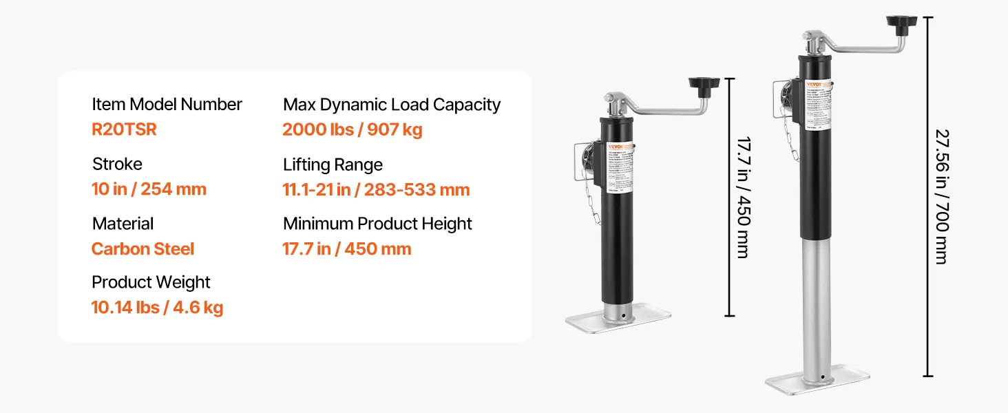 VEVOR aanhangwagenkrik, 907 kg dynamisch draagvermogen, lasbare draaibare krik met buisbevestiging, 283-533 mm aanhangwagenstandaard voor caravantrailers, paardentrailers, aanhangwagens en jachttrailers