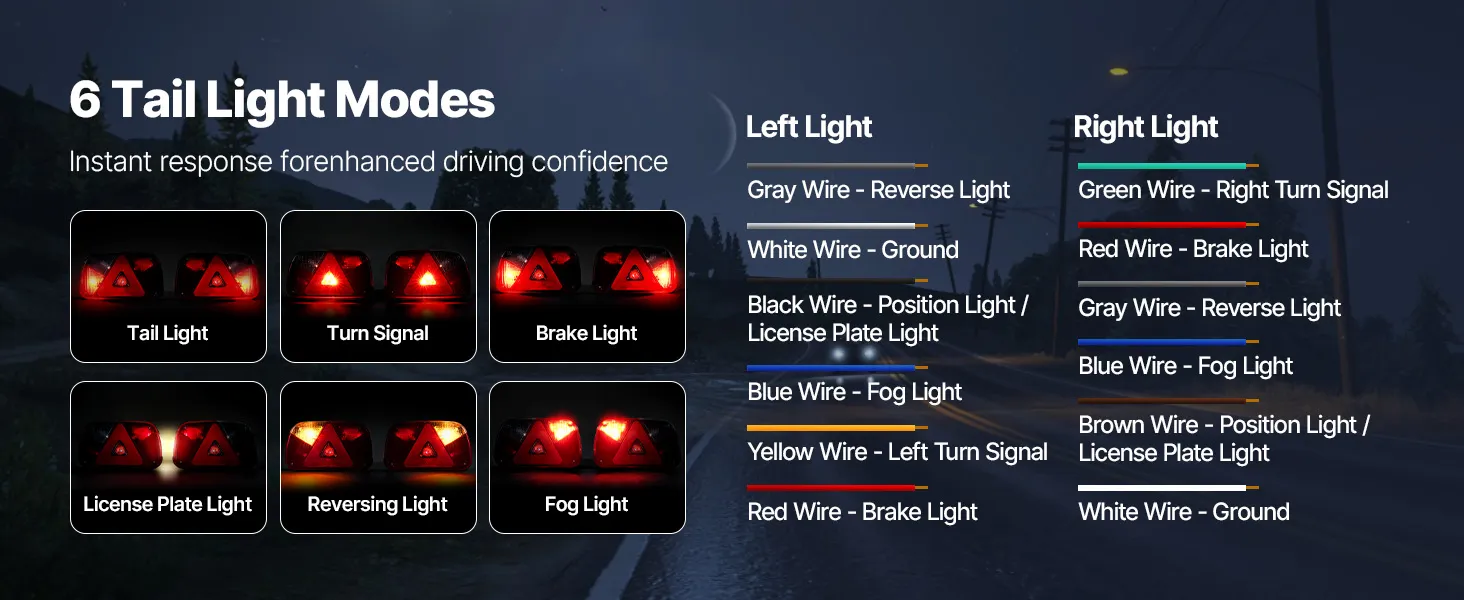 Snelle aansluiting: Onze waterdichte aanhangerverlichting heeft een intuïtief, kleurgecodeerd kabelontwerp dat het bedradingsproces eenvoudig en overzichtelijk maakt. De gekleurde kabels corresponderen met verschillende functies, waardoor achterlichten snel en nauwkeurig kunnen worden aangesloten en bedradingsfouten worden voorkomen.