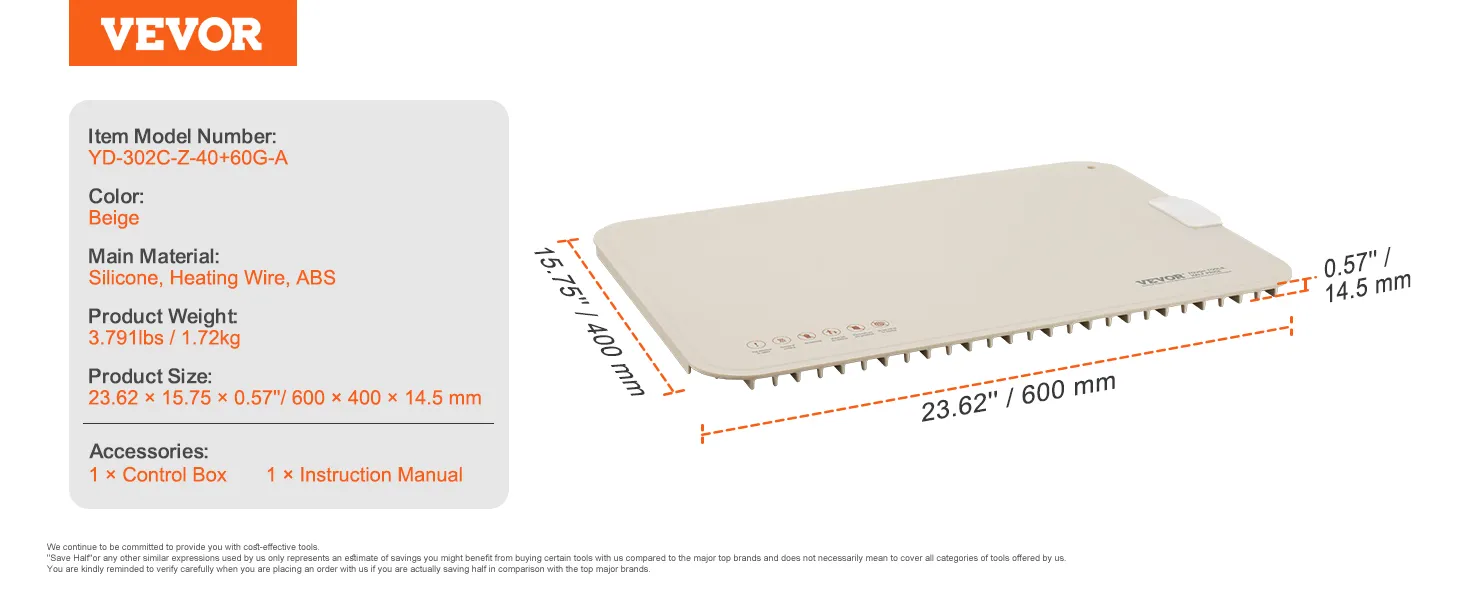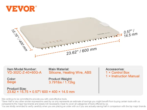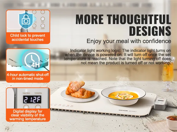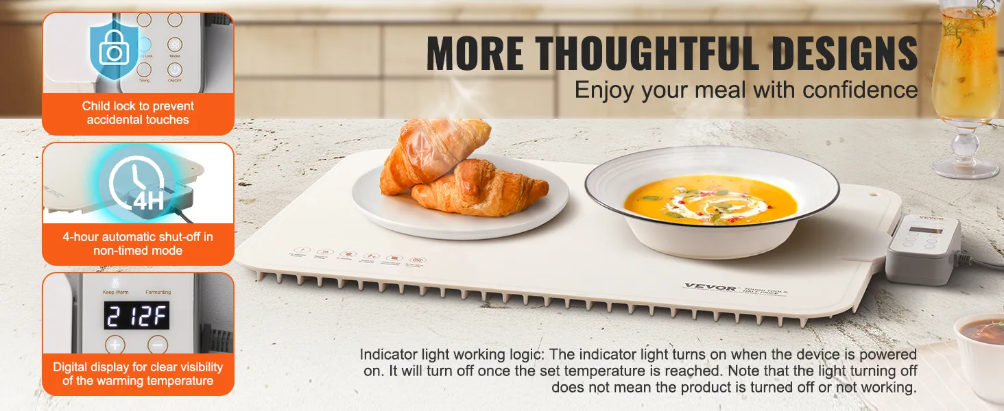 Keep Warm for a Long Time: With a spacious 23.62 x 15.75 inch surface, this electric warming tray uses metal heating wires at the bottom to provide continuous, even heat for up to 12 hours, keeping your food warm so you can enjoy warm meals at any time. The indicator light turns on when powered and turns off once the desired temperature is reached. Note: The light turning off does not mean the product has stopped working.