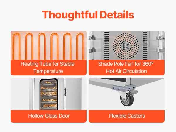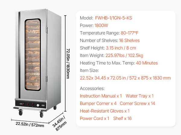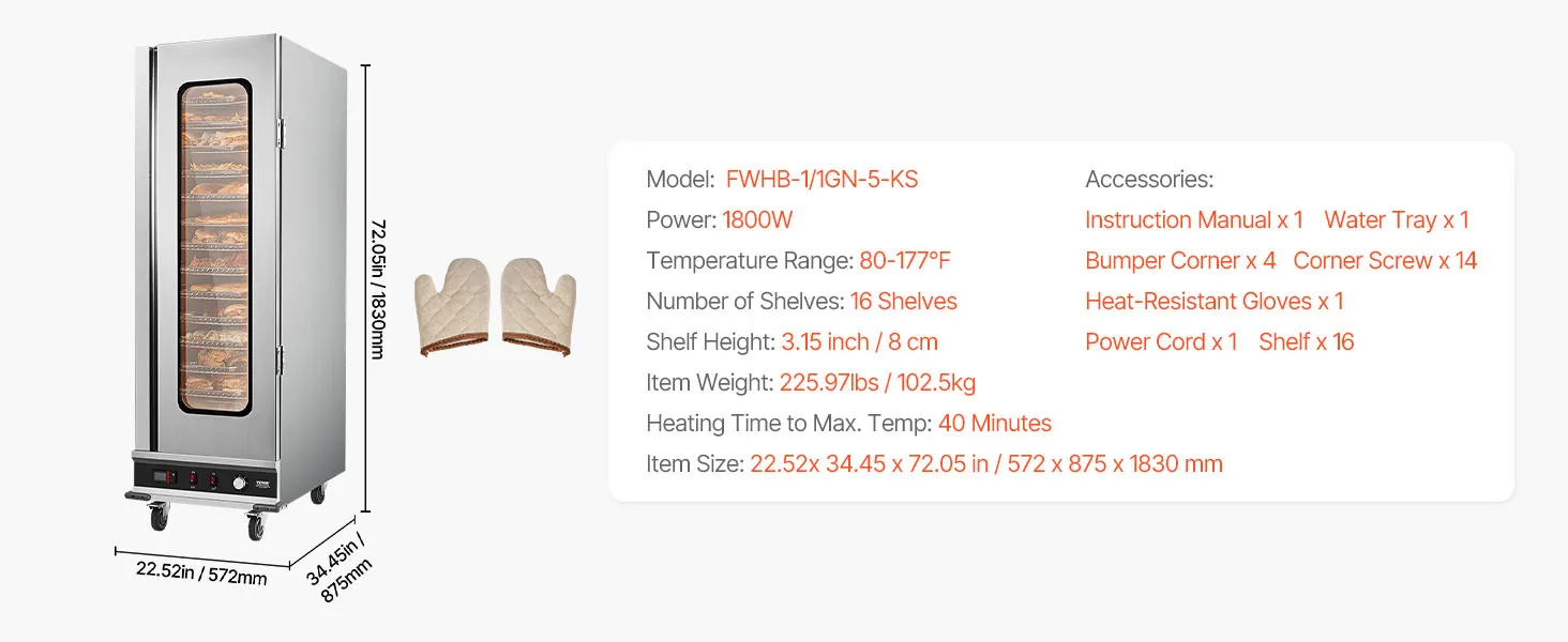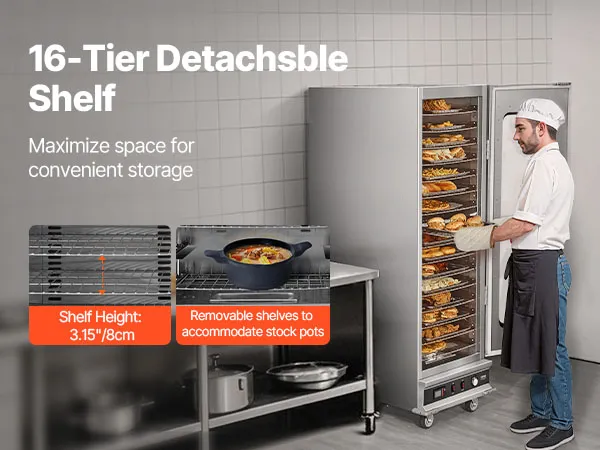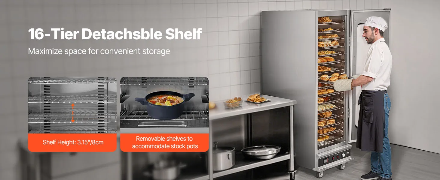 Spacious Multi-Tier Design: This food warmer cabinet includes 16 spacious shelves with a height of 3.15"/8cm, and can each hold one full-size 1/1 GN pan. The shelves are durable and suitable for various food trays, with the flexibility to be removed for taller items.