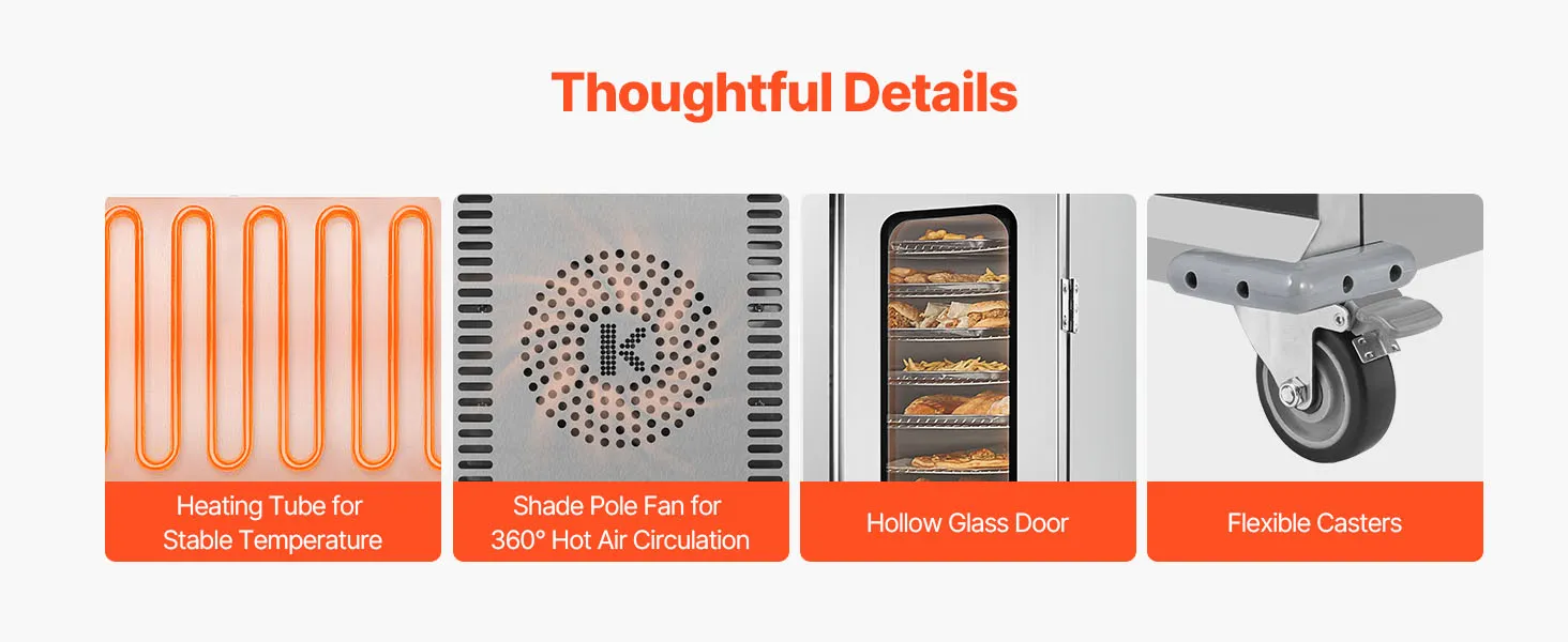 Keep Warm for a Long Time: The commercial hot box food warmer cabinet features an adjustable temperature range of 80℉-177℉ with rapid heating and long-lasting warmth. Real-time temperature tracking and simple operation make it perfect for storing delicious, juicy cooked meats, pasta, crispy fried foods, fermented yogurt, and dried fruits and vegetables.