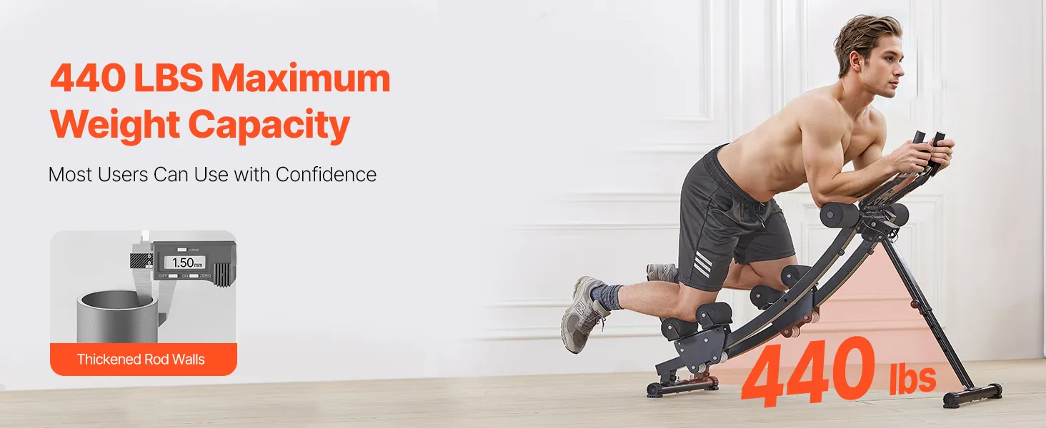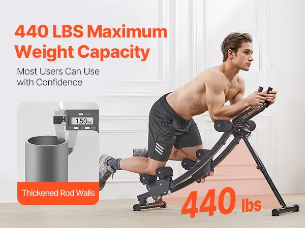 Safe and Stable Structure: Maximum Weight Capacity: 440 lbs / 200 kg. The core & abdominal trainers has a stable triangular structure built with heavy-duty carbon steel. The thick soft knee pads and foam-covered handles can stabilize your posture, reduce knee friction, and ensure high durability and comfortable workouts.