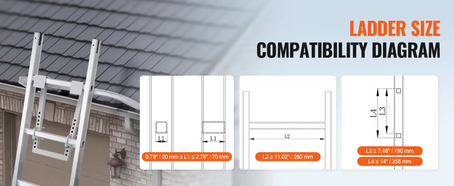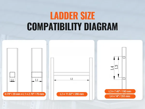 Brede compatibiliteit: past perfect op ladders met een tredebreedte van ≥ 11,02 inch (ca. 28 cm). Geschikt voor alle soorten ladders – hout, glasvezel of aluminium – en dus een perfecte match. Gemaakt van hoogwaardig staal voor duurzaamheid en stabiele ondersteuning.
