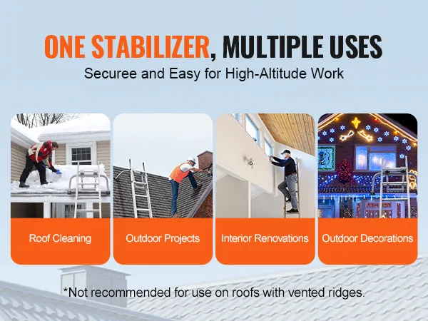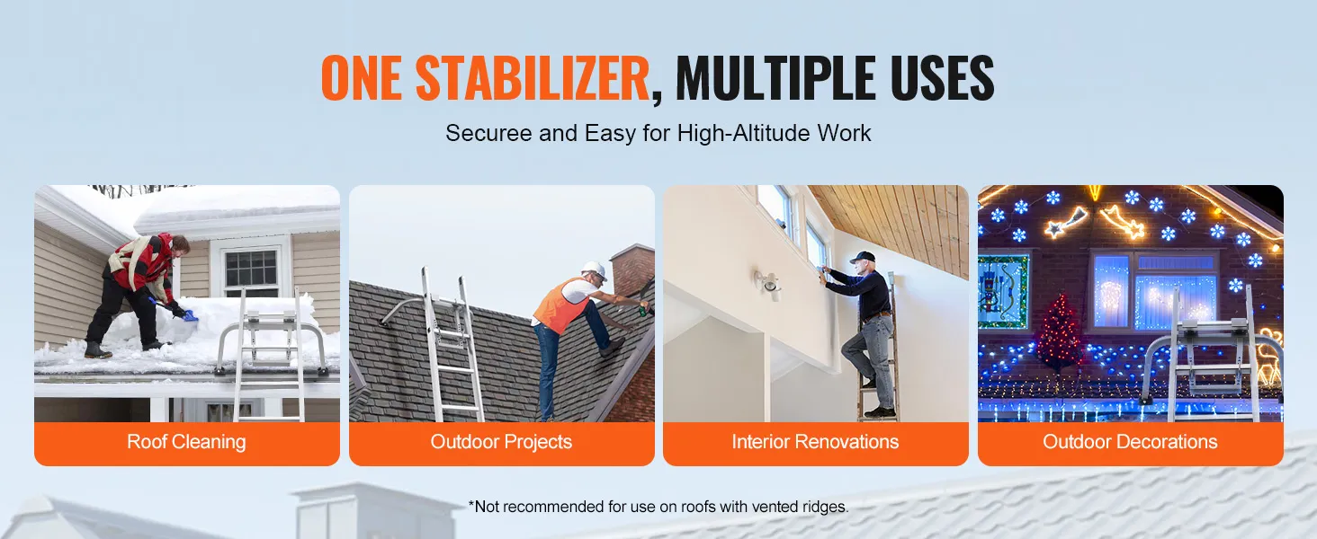 Onze ladderstabilisator is ontworpen voor diverse toepassingen en maakt werken op hoogte eenvoudig en veilig. Ideaal voor dakreiniging, buitenwerkzaamheden, binnenrenovaties en buitendecoraties. Let op: Niet geschikt voor daken met geventileerde nokken.