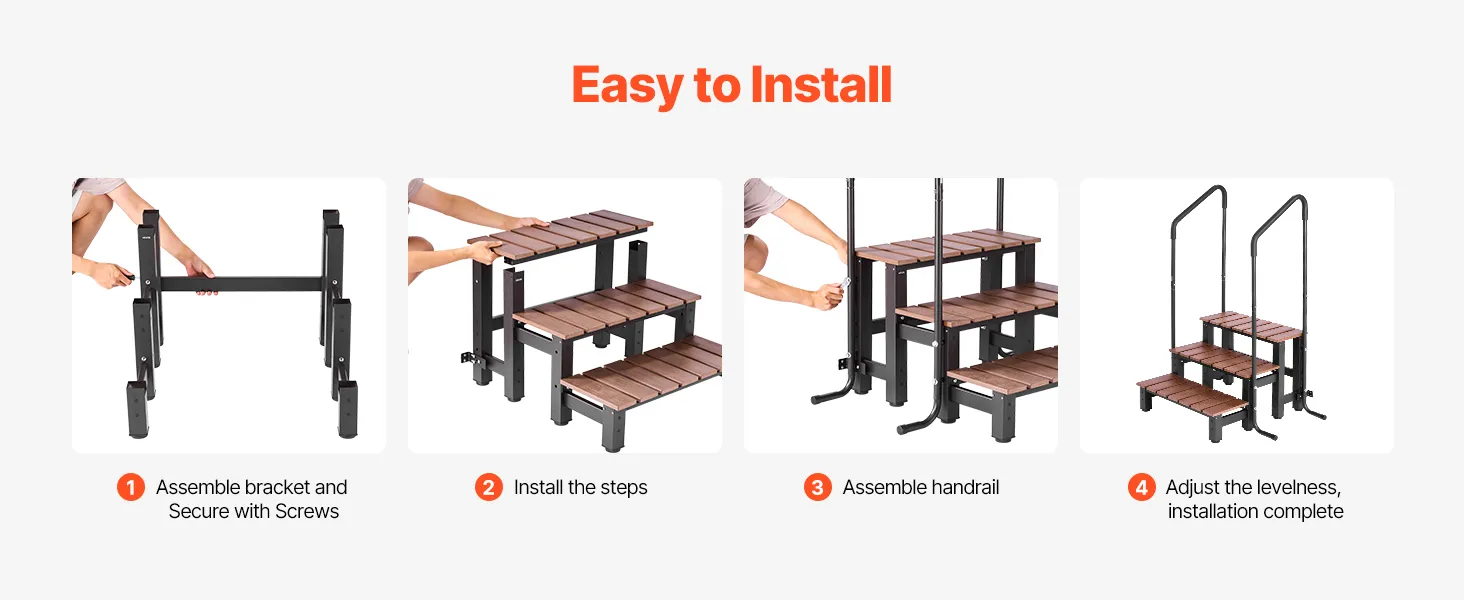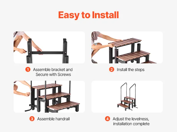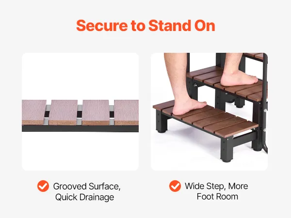 Veilig op- en afstappen: Extra brede treden en een metalen leuning bieden stevige ondersteuning en voorkomen evenwichtsverlies tijdens het op- en afstappen. Het 90° steunpootontwerp verhoogt de stabiliteit en voorkomt wiebelen, voor zorgeloos gebruik.