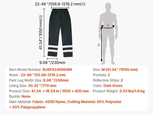 Convenient to Wear: Designed for versatility, these chainsaw chaps come in multiple sizes with an adjustable belt suitable for waist sizes from 22 to 48 inches (55.88 to 121.92 cm), and feature a full leg length of 41.34 in /105 cm (from the waist to the top of the foot, not the seam length).