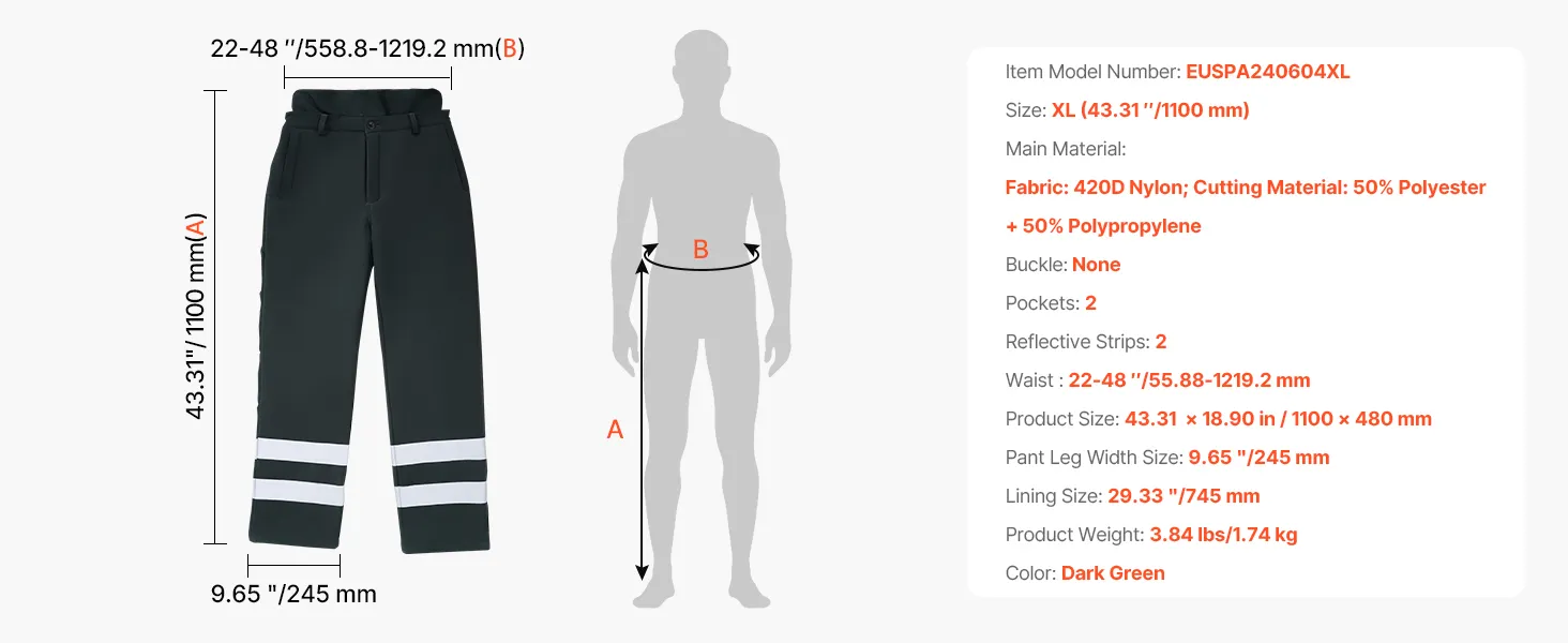 Comfortabel om te dragen: Deze veelzijdige kettingzaagbroeken zijn verkrijgbaar in verschillende maten met een verstelbare riem voor een tailleomvang van 55,88 tot 121,92 cm (22 tot 48 inch) en hebben een beenlengte van 110 cm (van taille tot bovenkant voet, niet de naadlengte).