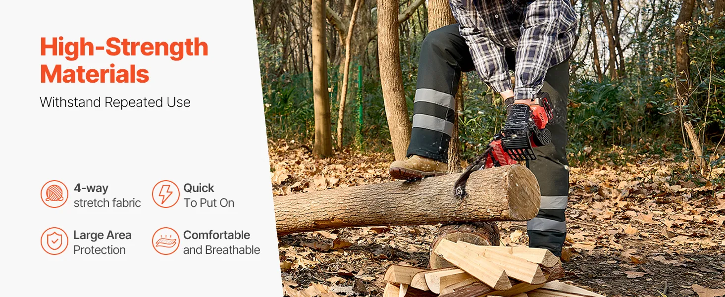 Duurzaam materiaal: Deze kettingzaagbroeken zijn gemaakt van 420D nylon en zijn vervaardigd van een snijbestendige mix van 50% polyester en 50% polypropyleen. Ze zijn voorzien van versterkte naden voor een betere duurzaamheid in zware omstandigheden.