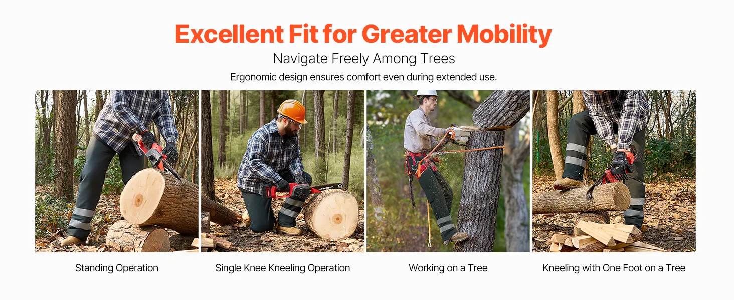 Hoog comfort: Deze lichtgewicht kettingzaagbroeken zijn ergonomisch ontworpen en zitten comfortabel. Ze zorgen voor meer bewegingsvrijheid in verschillende werkposities, terwijl de zachte binnenvoering slijtage en blessures bij langdurig gebruik voorkomt.