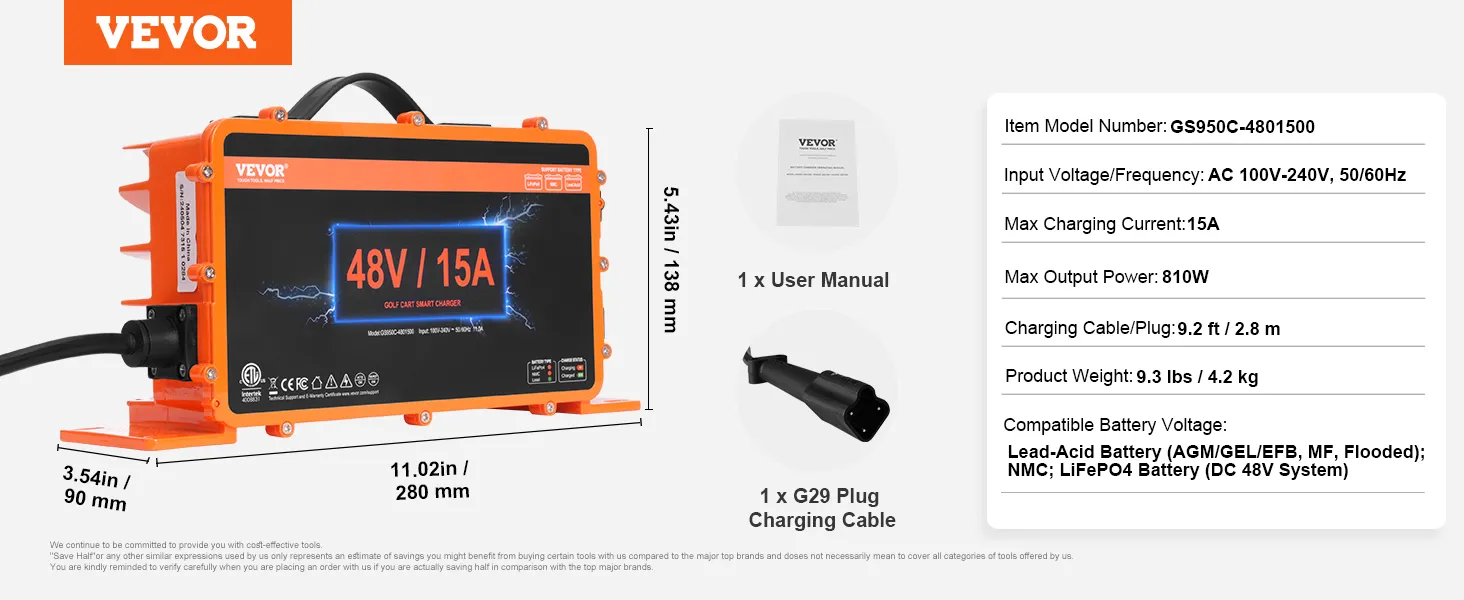 VEVOR 48V golfkar-acculader, 15A slimme acculader met G29-stekker, compatibel met loodzuur AGM/GEL/EFB MF natte NMC LiFePO4-accu's voor Yamaha, IP67