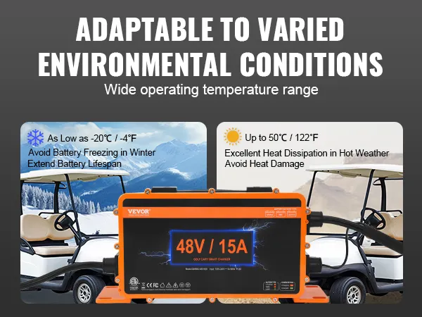 Onze golfkar-oplader is ontworpen om te werken in een breed temperatuurbereik van -20°C/-4°F tot 50°C/122°F. Het beschermt batterijen tegen bevriezing in strenge winters en zorgt voor een uitstekende warmteafvoer in verzengende zomers.