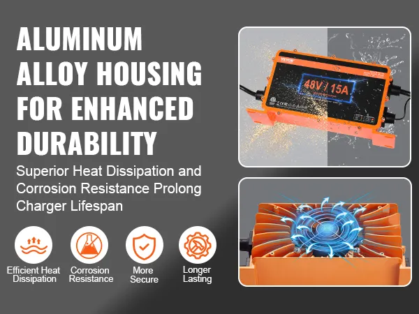 Onze golfkar-acculader is gemaakt van een duurzame aluminiumlegering en voert de warmte effectief af om oververhitting te voorkomen en gemoedsrust te garanderen.