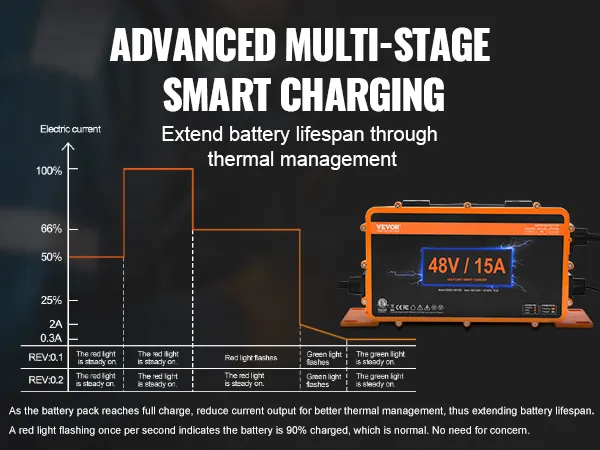 Onze slimme batterijlader is voorzien van geavanceerde meertrapslaadtechnologie en uitstekend thermisch beheer om schade aan de batterij te minimaliseren en de gezondheid van de batterij te bevorderen. Het vermindert de stroomopbrengst wanneer de batterij volledig is opgeladen.