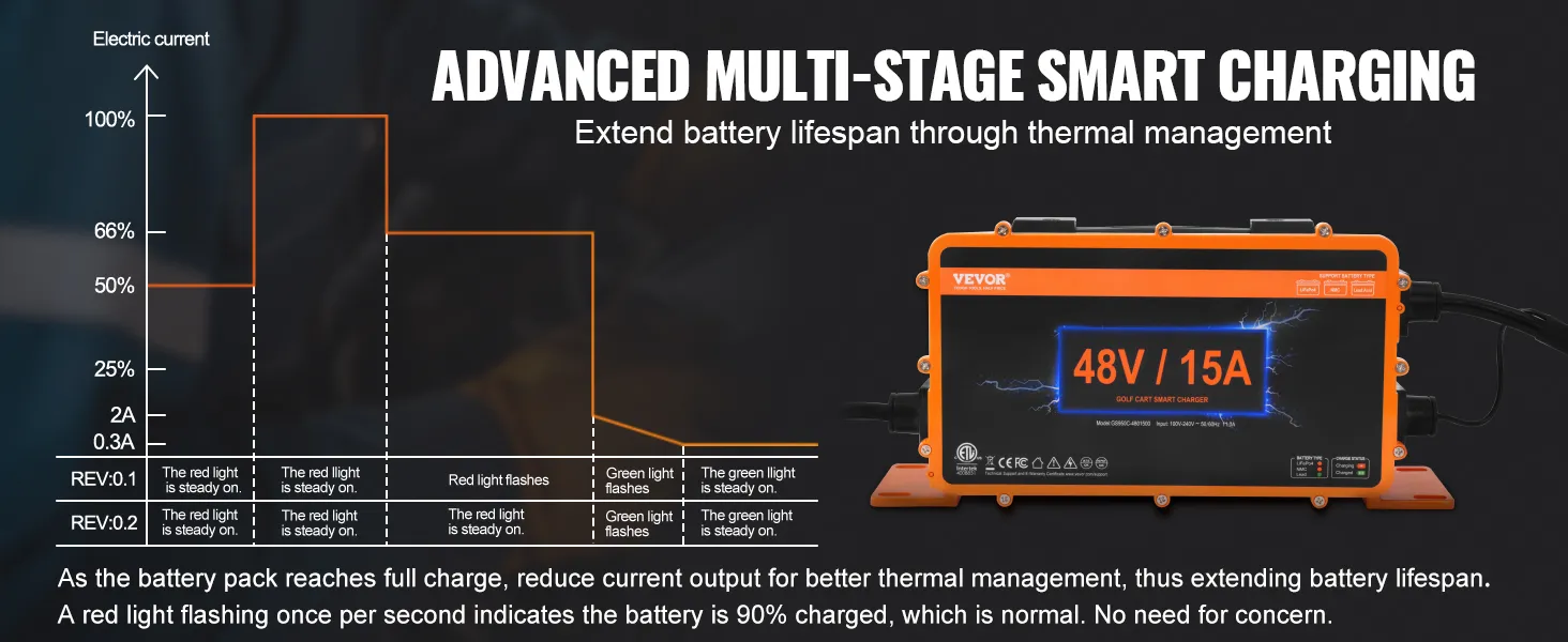 • Echte 3 batterijcompatibiliteit: met onze batterijlader voor golfkarretjes kunt u uw batterijen snel opladen. Het is compatibel met loodzuur-, lithium- en LiFePO4-batterijen en is perfect voor golfkarretjes met verschillende batterijtypen. Zeg vaarwel tegen meerdere opladers en geniet van het naadloos opladen van uw verschillende batterijtypes met één krachtig apparaat.