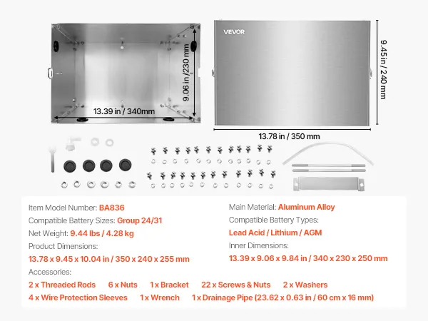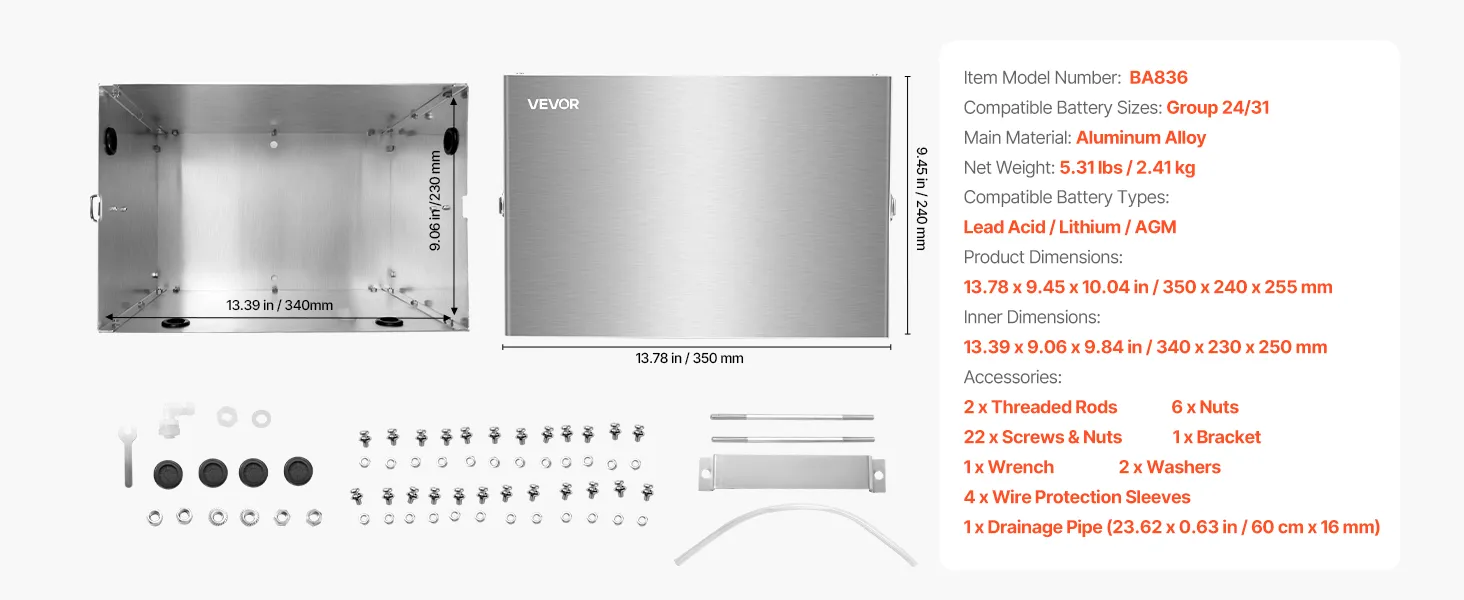 VEVOR Accubox, Groep 24/31, Accubox voor Marine Accu's met Handgrepen en Kabelgaten met Rubberen Doorvoertule, Aluminium Behuizing, Geschikt voor Off-Road Race Auto's en Vrachtwagens