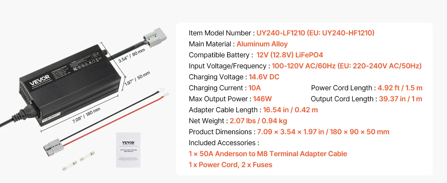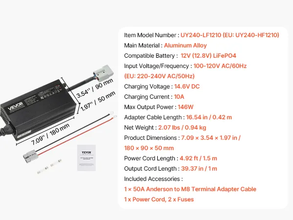 VEVOR 12V 10A Lithium Battery Charger, 14.6V, AC-DC LiFePO4 Smart Charger, with Anderson Connector, LED Indicator, 0V Activation, for Lithium LiFePO4 Deep Cycle Rechargeable Batteries of Boat, RV