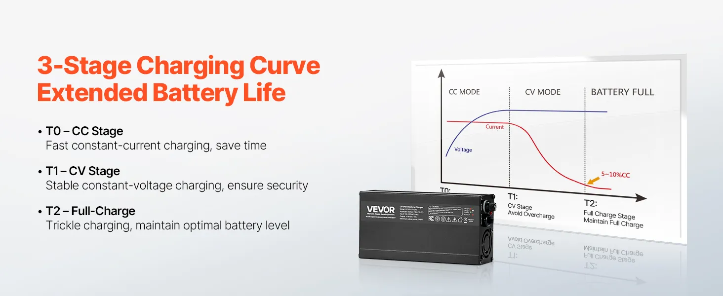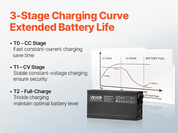 3-Stage Intelligent Charging Curve: Our LiFePO4 charger auto detects your battery's status. CC stage: rapid charging, CV stage: avoid overcharge, full charge stage: maintain full charge. LED indicators let you quickly check the charging status