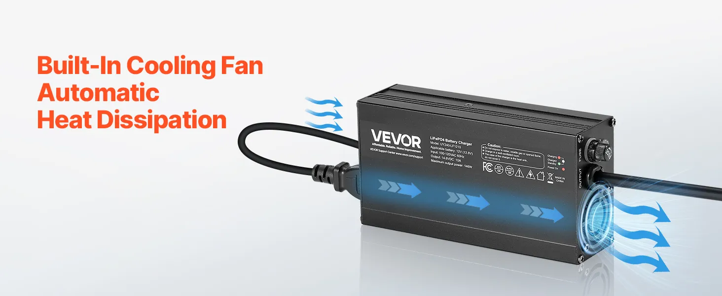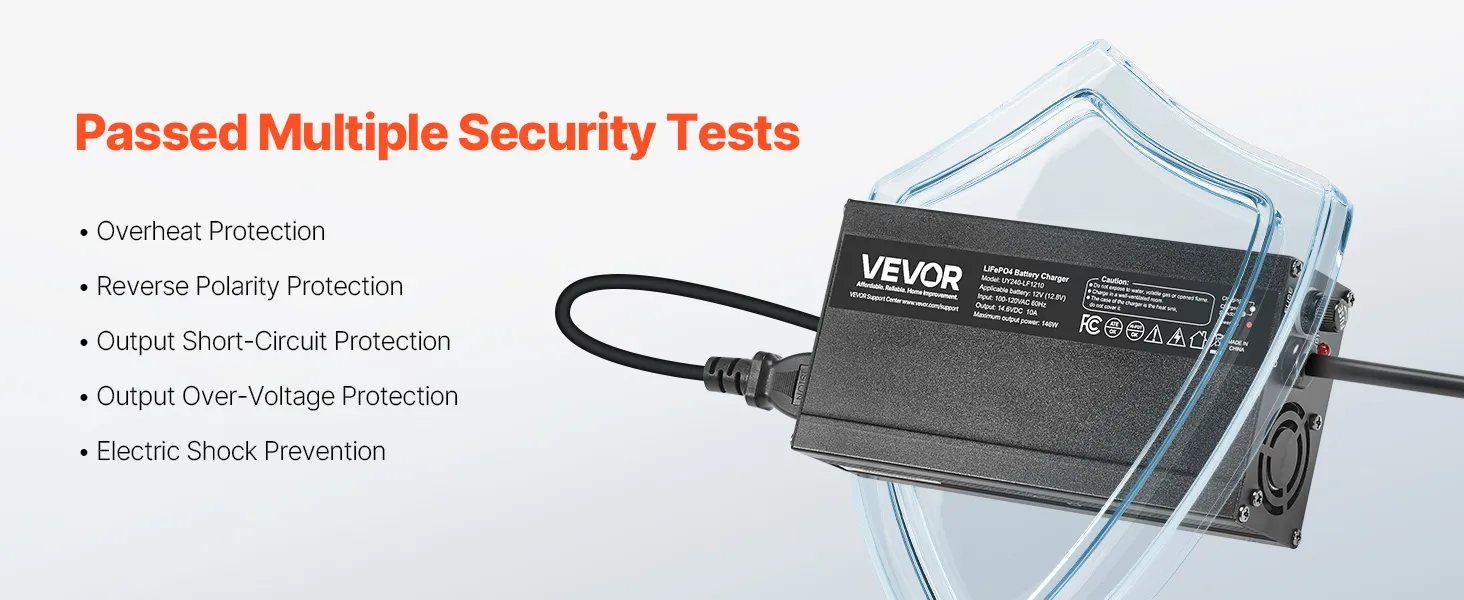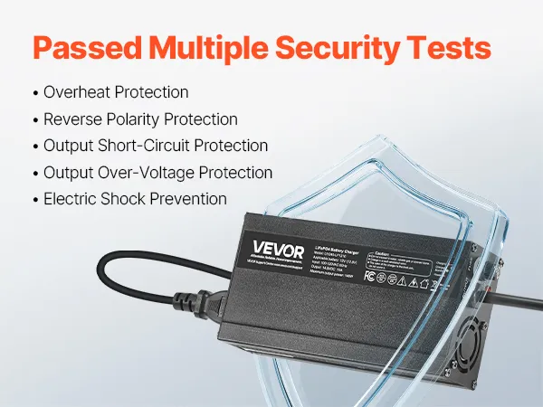 Security First, Protection Always: Our lithium smart battery charger is tested to CE standards. With overheat, reverse polarity, output short circuit, and overvoltage protection, plus a cooling fan, it provides a reliable charging experience
