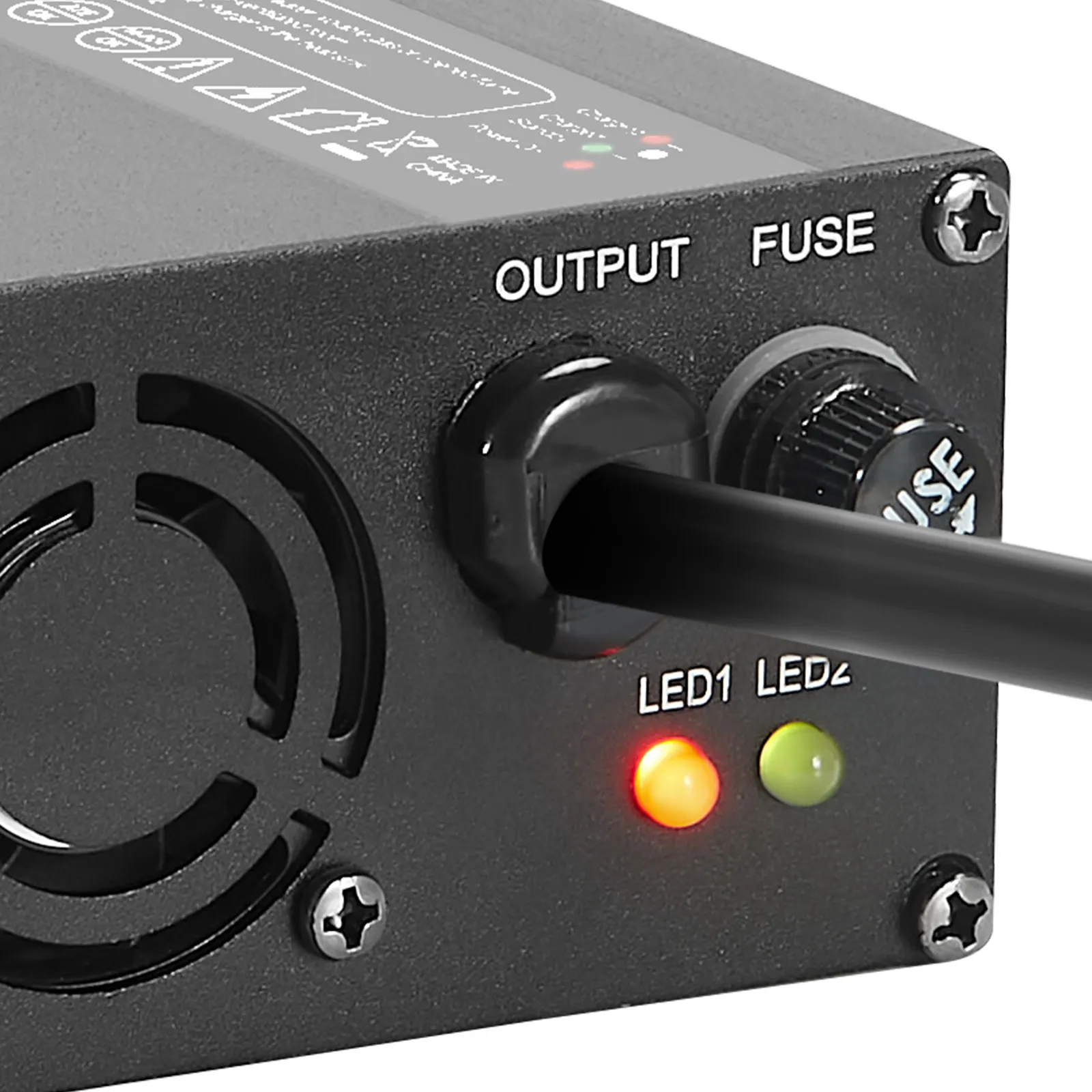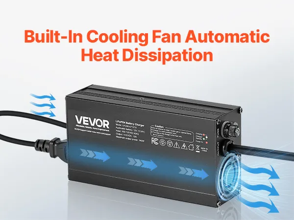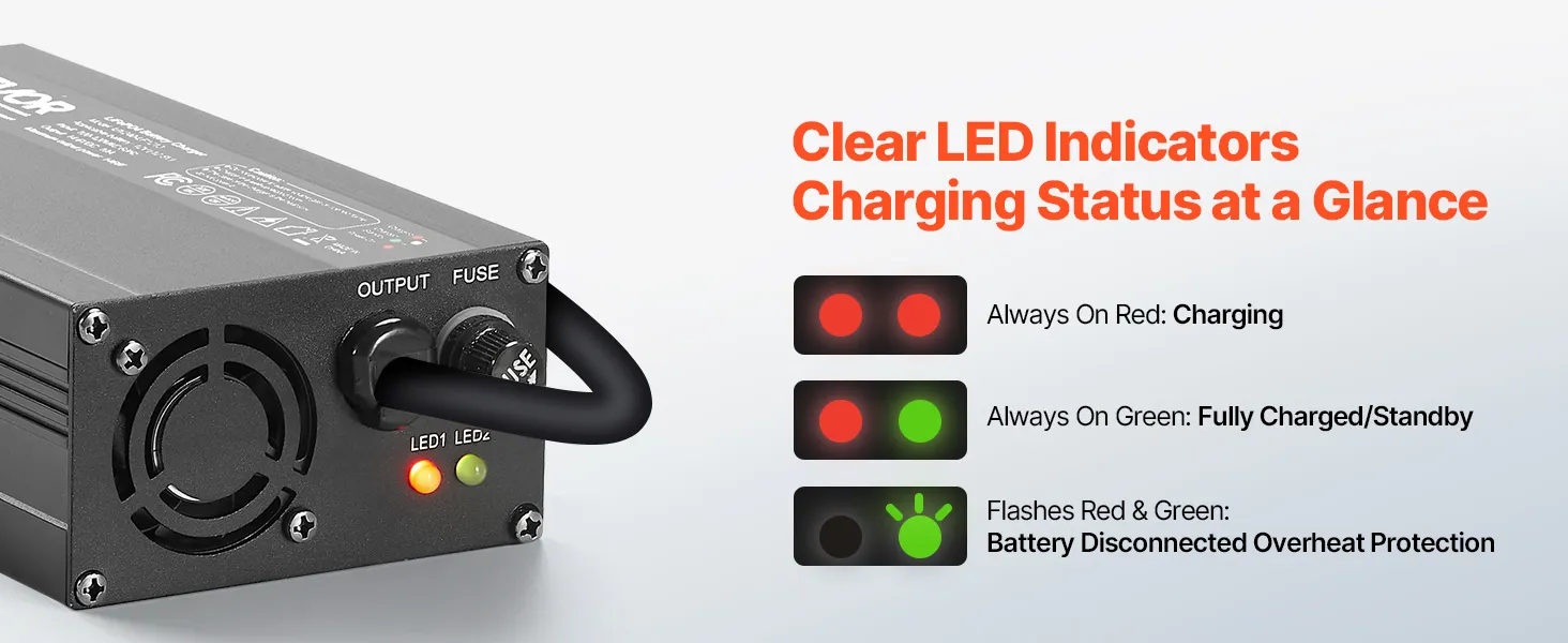 Our LiFePO4 battery charger includes a DC output, LED indicators, and a cooling fan for efficient and reliable charging.