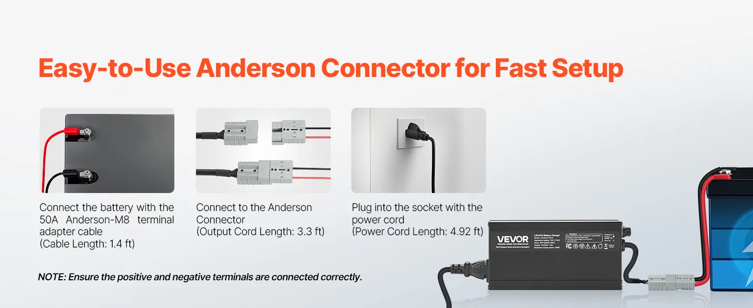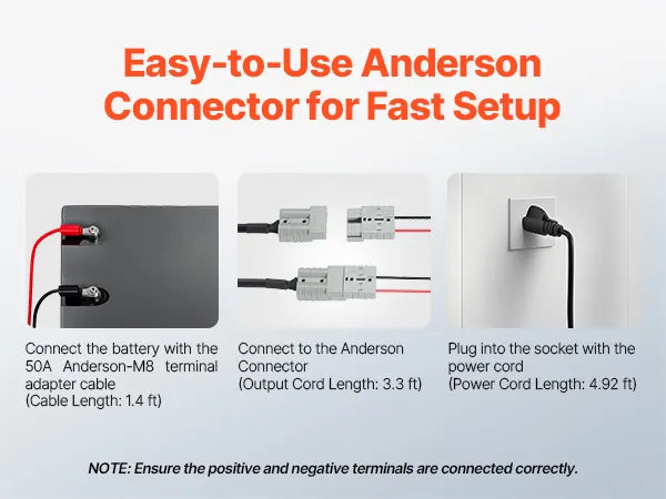 Upgraded Anderson Connector: The LiFePO4 smart charger comes with a 1.4 ft 50A Anderson-M8 terminal adapter cable for plug-and-play convenience. Ideal for RVs, boats, golf carts, solar systems, or any other lithium battery-powered equipment