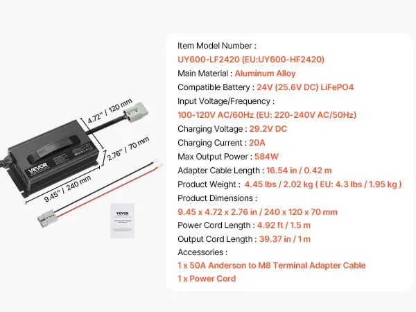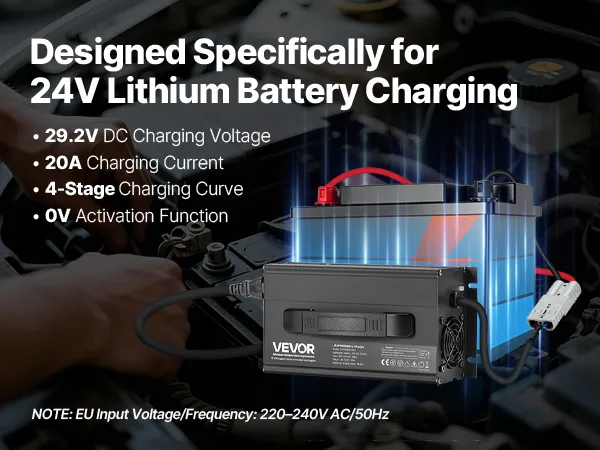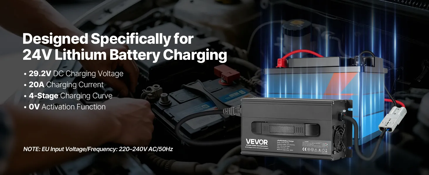 Designed for 24V LiFePO4 Batteries: This smart battery charger delivers a 29.2V DC charging voltage and 20A charging current. Fully charge a 100Ah battery in just 5 hours (Note: Not suitable for lead-acid batteries)