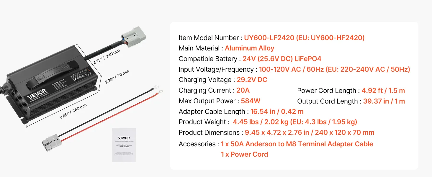 VEVOR 24V 20A Lithium Battery Charger, 29.2V, AC-DC LiFePO4 Smart Charger, with Anderson Connector, LED Indicator, 0V Activation, for Lithium LiFePO4 Deep Cycle Rechargeable Batteries of Boat, RV