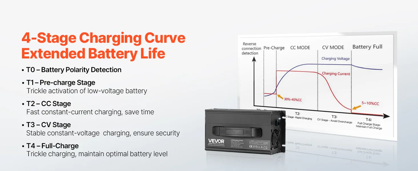 4-Stage Intelligent Charging Curve: Our LiFePO4 battery charger auto detects your battery's status. Precharge stage: wake low-voltage battery, CC stage: rapid charging, CV stage: avoid overcharge, full charge stage: maintain full charge