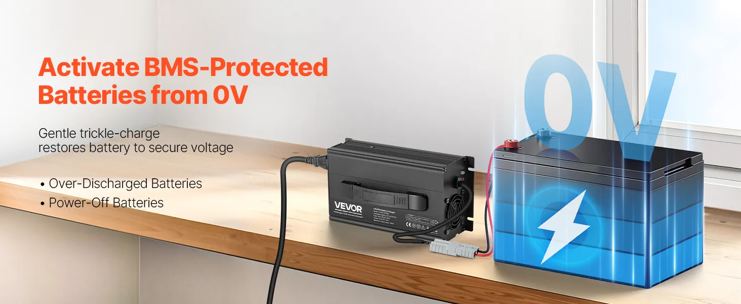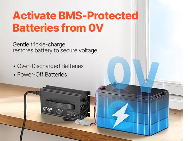 0V Secure Activation Function: No extra tools required! With the 0V activation feature, you can efficiently wake up batteries in BMS protection mode. It keeps battery damage from prolonged low voltage and easily charges low-voltage lithium batteries