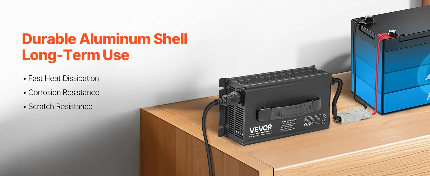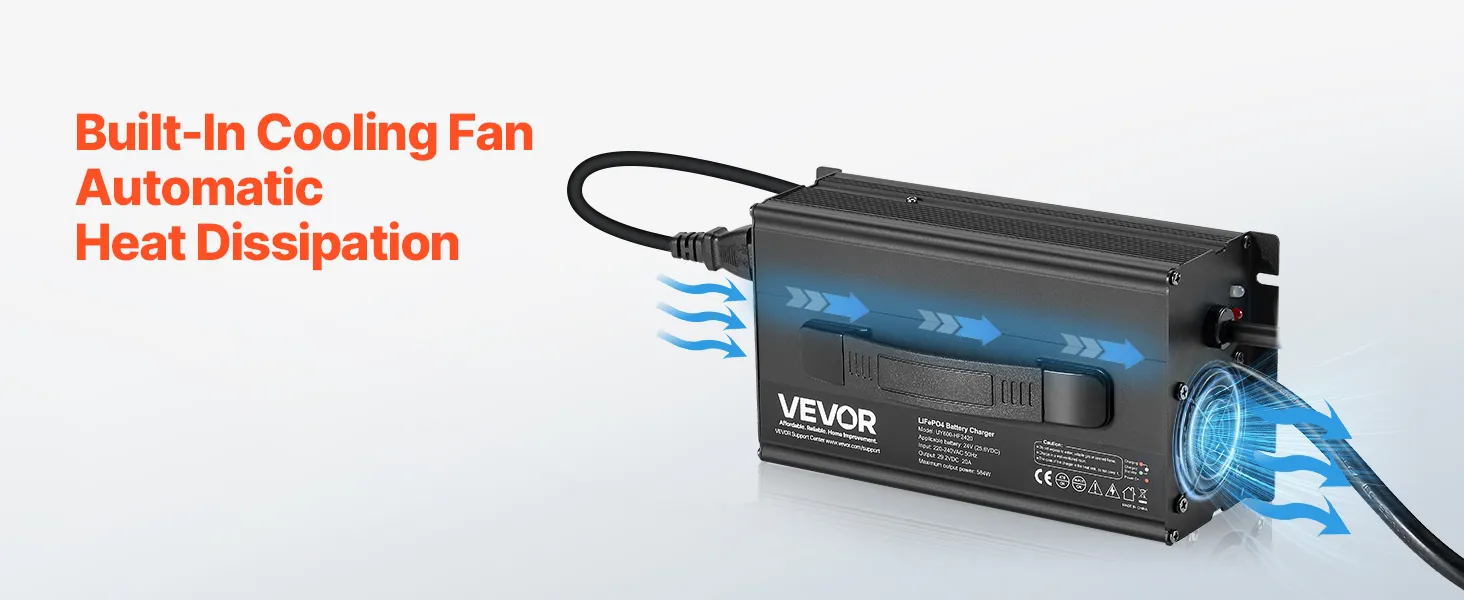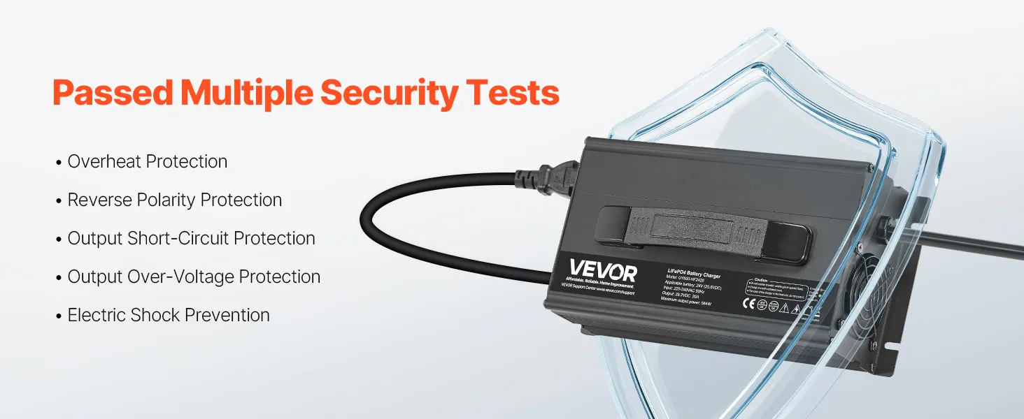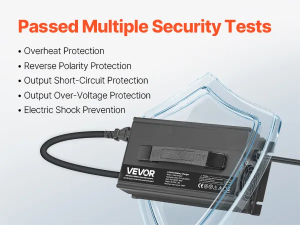 Security First, Protection Always: Our lithium smart battery charger is tested to CE standards. With overheat, reverse polarity, output short circuit, and overvoltage protection, plus a cooling fan, it provides a reliable charging experience