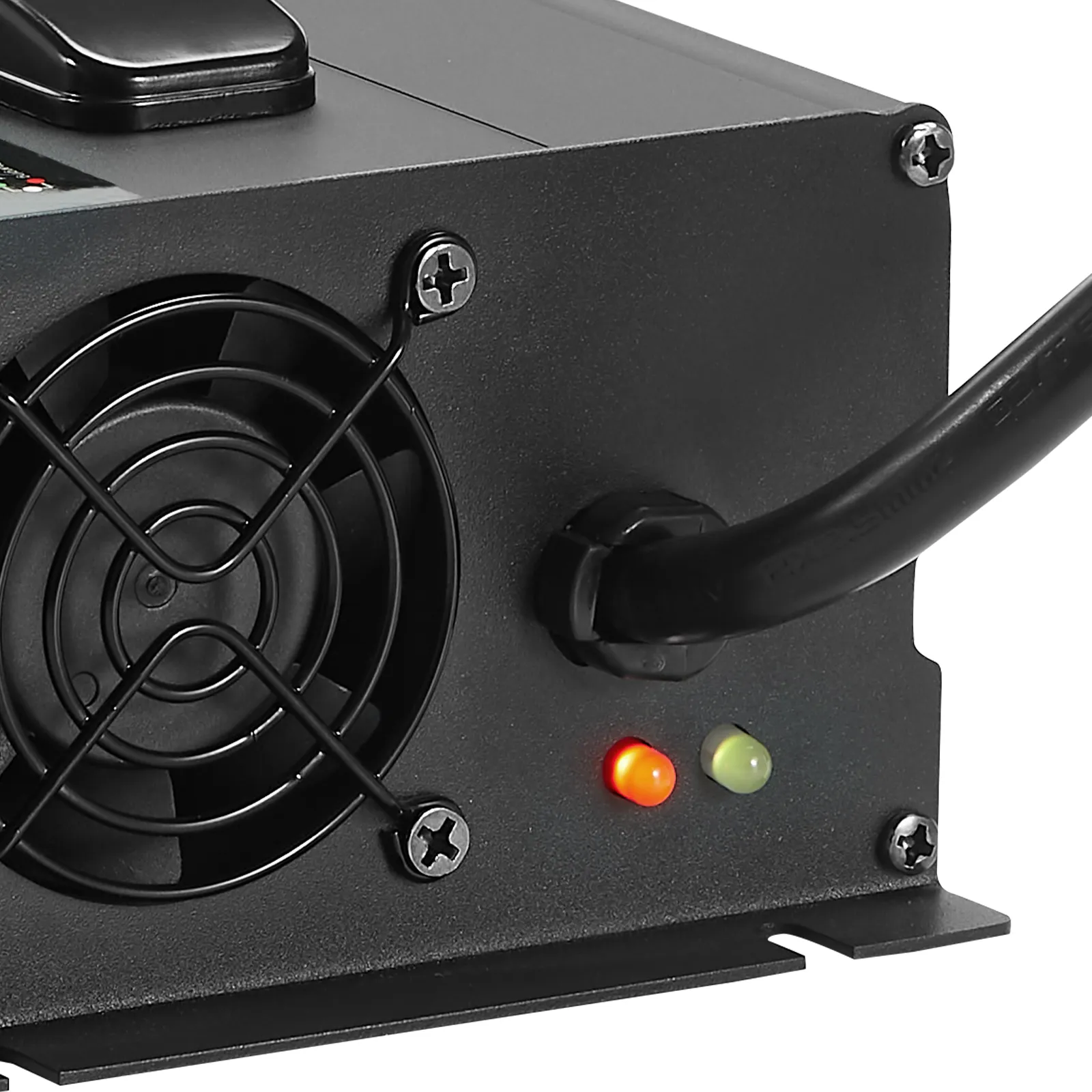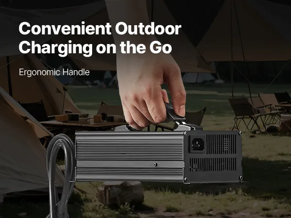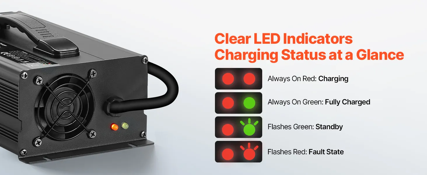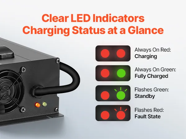Our LiFePO4 battery charger includes a DC output, LED indicators, and a cooling fan for efficient and reliable charging.