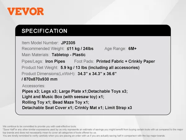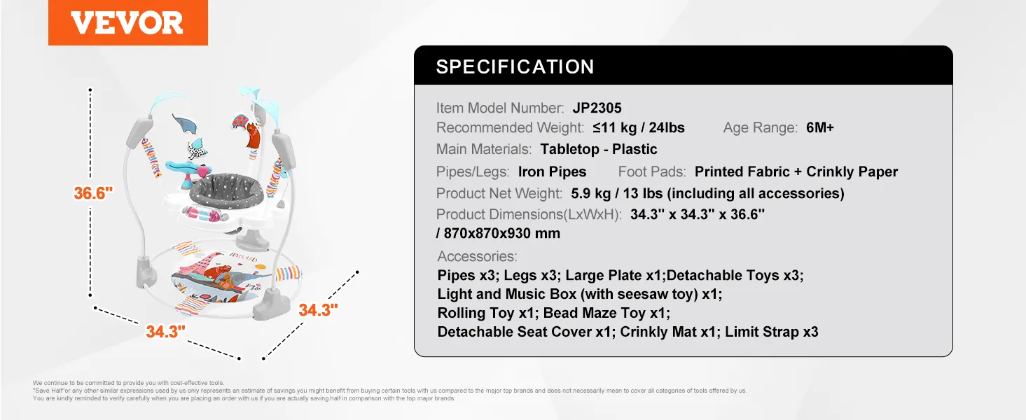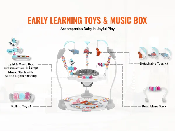 Handsfree ervaring: Kleurrijk speelgoed, leuke geluiden en muziek stimuleren en activeren de visuele en auditieve zintuigen van de baby. Het op veiligheid gerichte ontwerp van onze babytruien en uitsmijters creëert een leuke speeltuin voor baby's, zodat moeders kunnen ontspannen in de wetenschap dat hun baby graag alleen speelt.