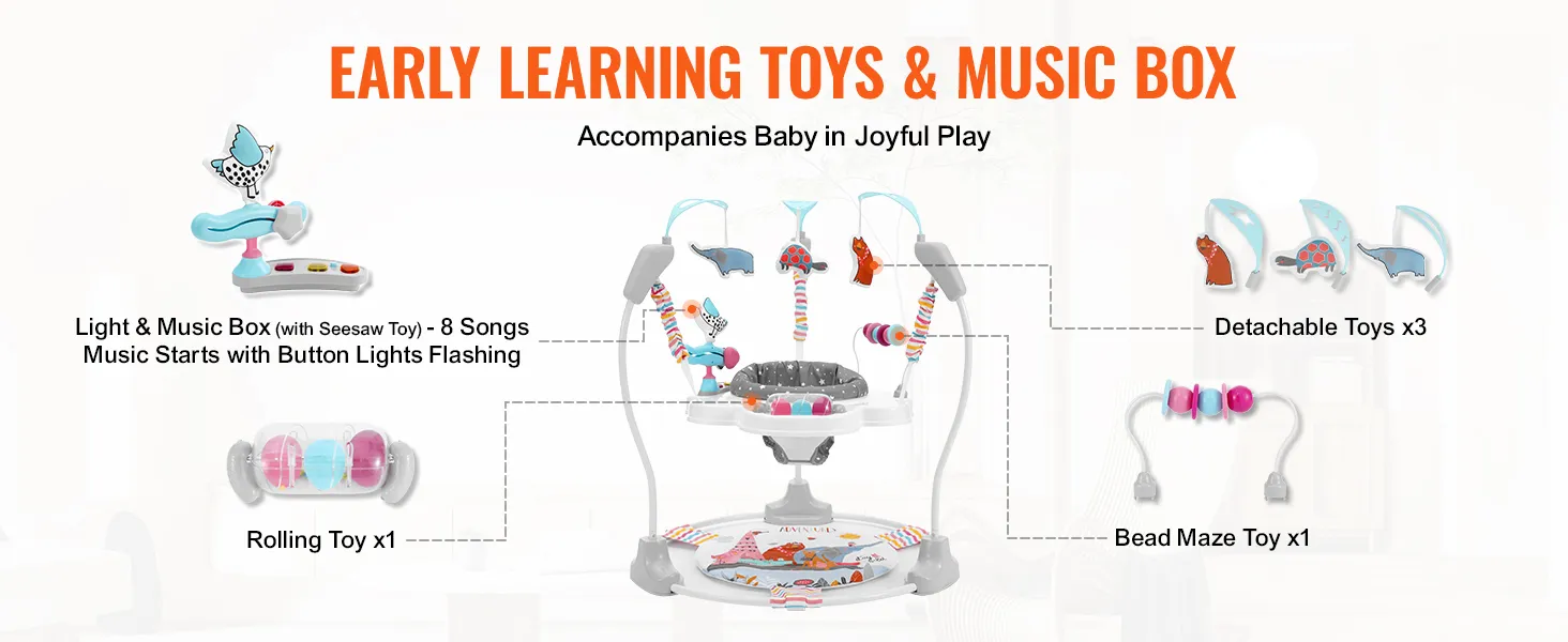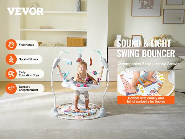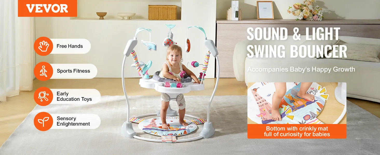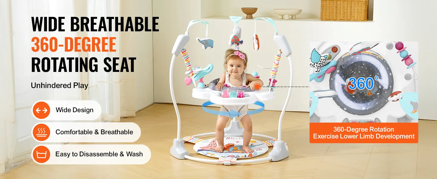 VEVOR Baby Bouncer, Baby Activity Center, 360° draaibaar en in hoogte verstelbaar, Speeljumper voor peuters met ontwikkelingsspeelgoed, muziek, lichtjes en geluiden, Ruimtebesparende Baby Jumperoo voor kinderen vanaf 6 maanden
