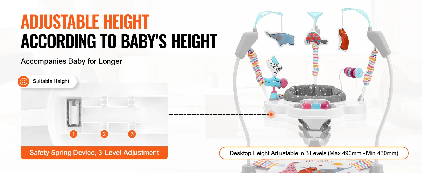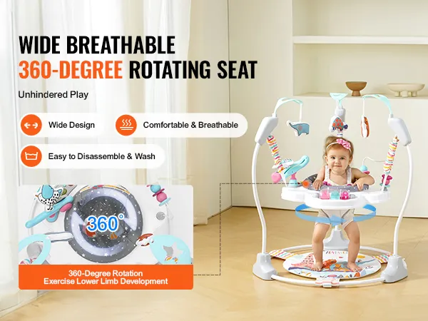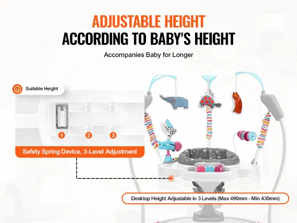 360 GRADEN ROTATIE EN VERSTELBARE HOOGTE: Beschikt over een 360 graden draaibare stoel waarmee de baby vrij kan draaien en stuiteren, waardoor de oefening en ontwikkeling van de onderste ledematen wordt ondersteund. 3 hoogte-instellingen maken aanpassing aan verschillende babygroottes mogelijk, waardoor baby's veilig en comfortabel kunnen spelen.