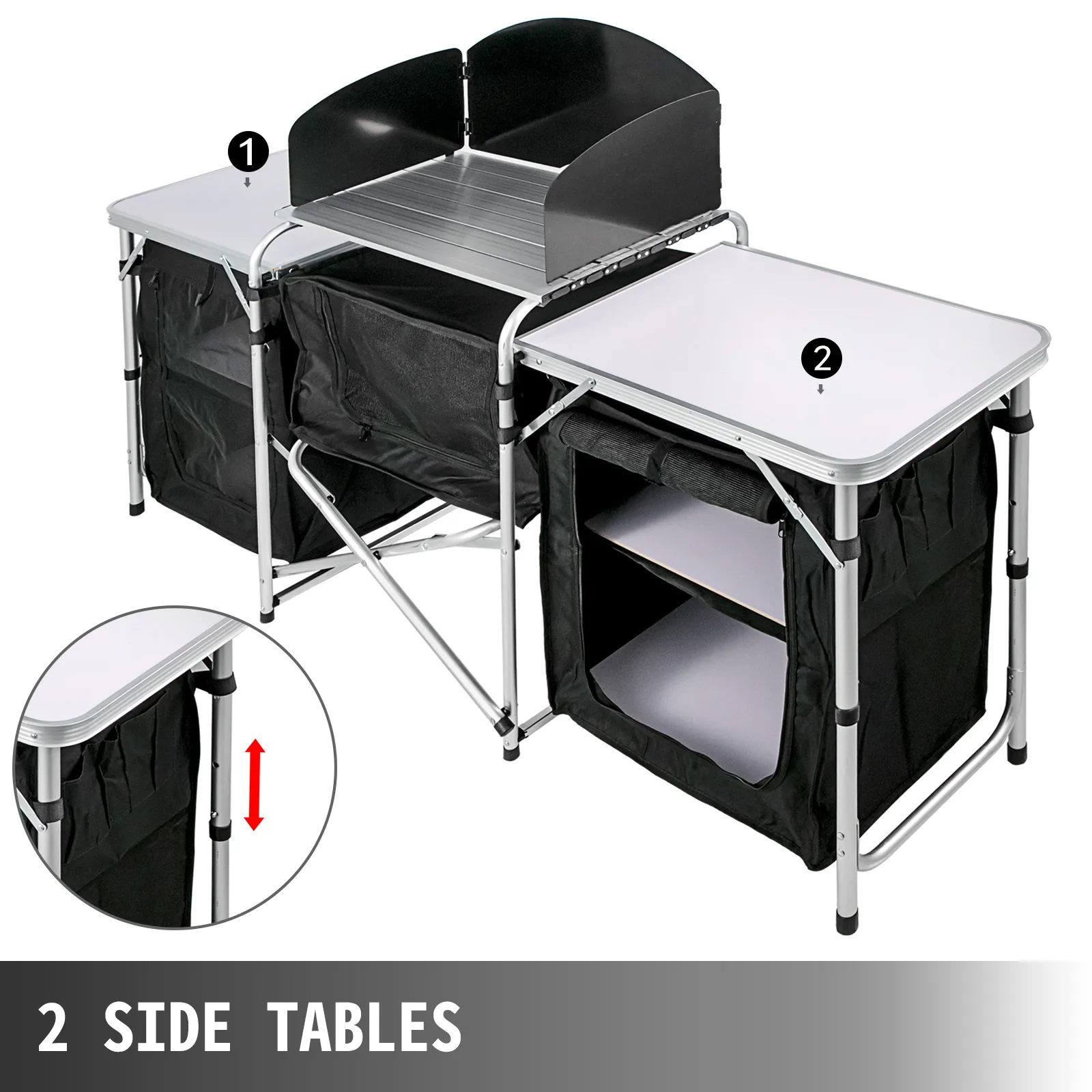 Deze draagbare buitenkeuken wordt ondersteund door X-vormige beugels van aluminiumlegering voor een sterke stabiliteit. Het wordt geleverd met 2 bijzettafels, 1 aanrecht en 3 vakken met ritssluiting voor veel opbergruimte. Deze outdoor kooktafel is afneembaar en opvouwbaar, geschikt voor buitenactiviteiten.