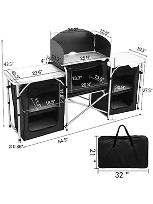 Deze draagbare keukentafel is afneembaar en opvouwbaar. Het kan worden opgeborgen in een tas van 31x21x5 inch. Geschikt voor diverse buitenactiviteiten.