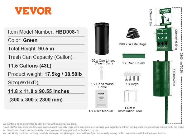 This 11.5-gallon green dog waste station comes with 600 pickup bags and 50 trash bags, crafted from durable galvanized steel. It's ideal for pet-friendly spots like parks, backyards, residential areas, and grooming salons!