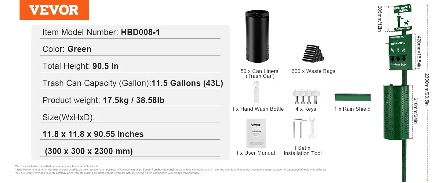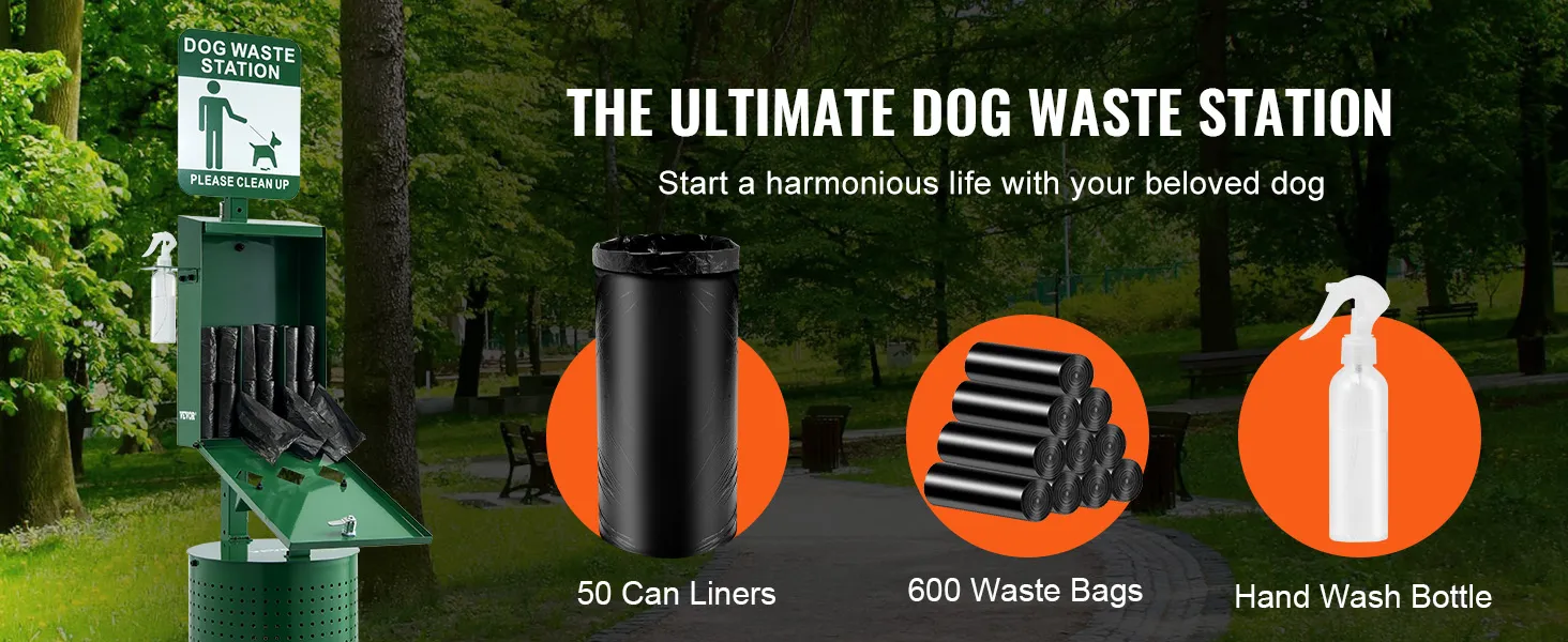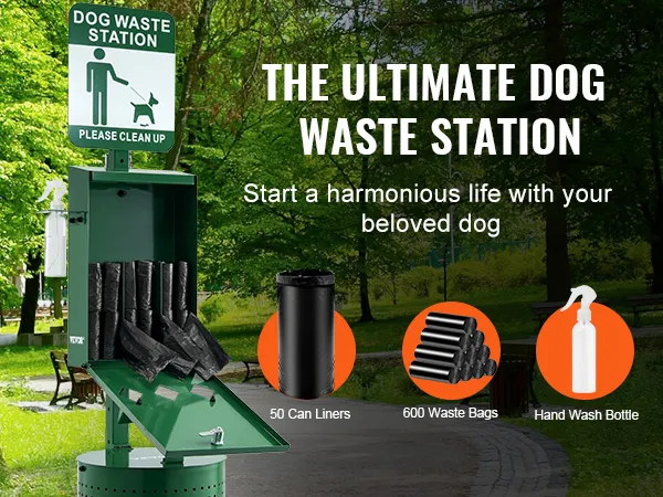 VEVOR Dog Waste Station with Hand Wash Bottle, Commercial Dog Poop Station, 11.5 Gallons Pet Waste Bin with 50 Can Liners, Bag Dispenser & 600 Waste Bags, Outdoor Dog Waste Disposal System for Backyard