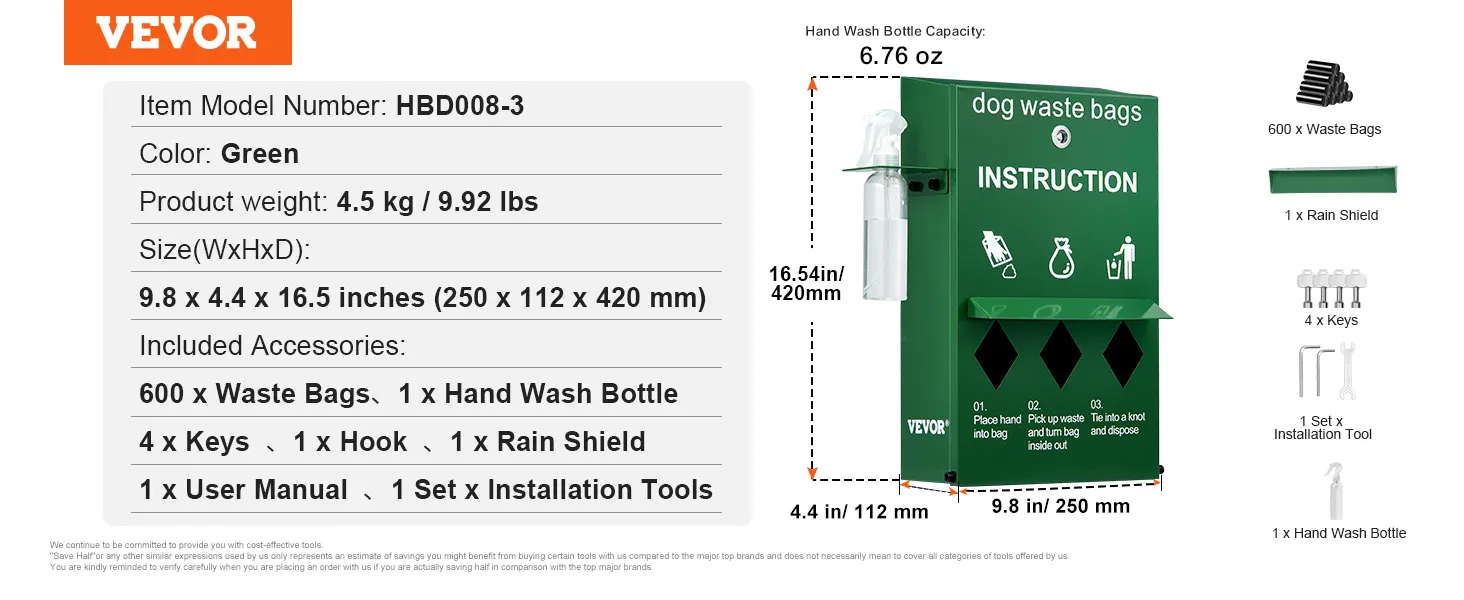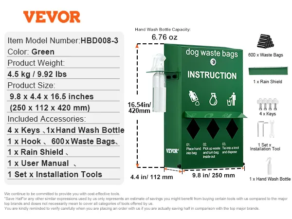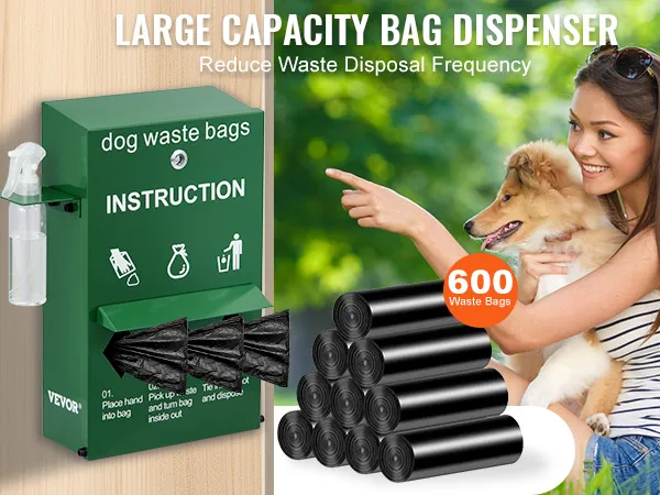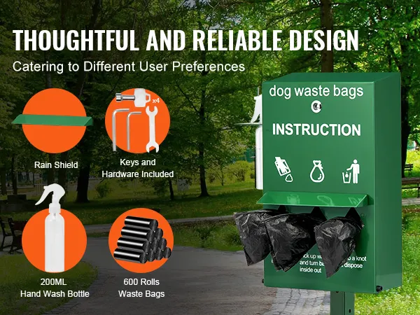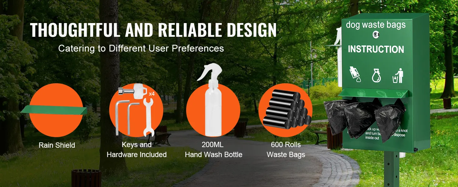VEVOR Dog Poop Bag Dispenser with Hand Wash Bottle, Lockable Outdoor Dog Waste Bag Holder with 600 Waste Bags, Stake, Pole, Fence & Wall Mounted Dog Poop Bag Storage, Pet Waste Station for Porch, Lawn