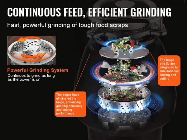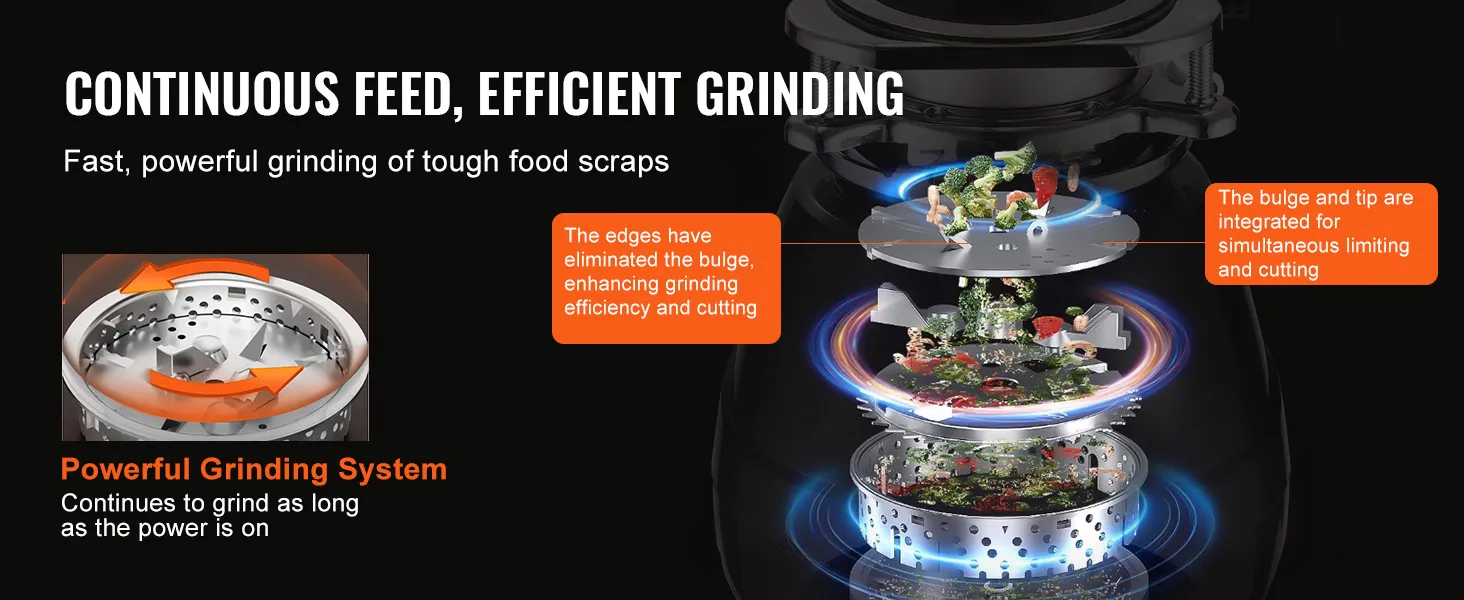 Continuous Feed: This kitchen sink disposal supports continuous feed with multi-stage grinding to effectively handle various kitchen waste. Effortlessly crushes vegetable peels, bones, fruit pits, and more, minimizing clogging for smoother operation.